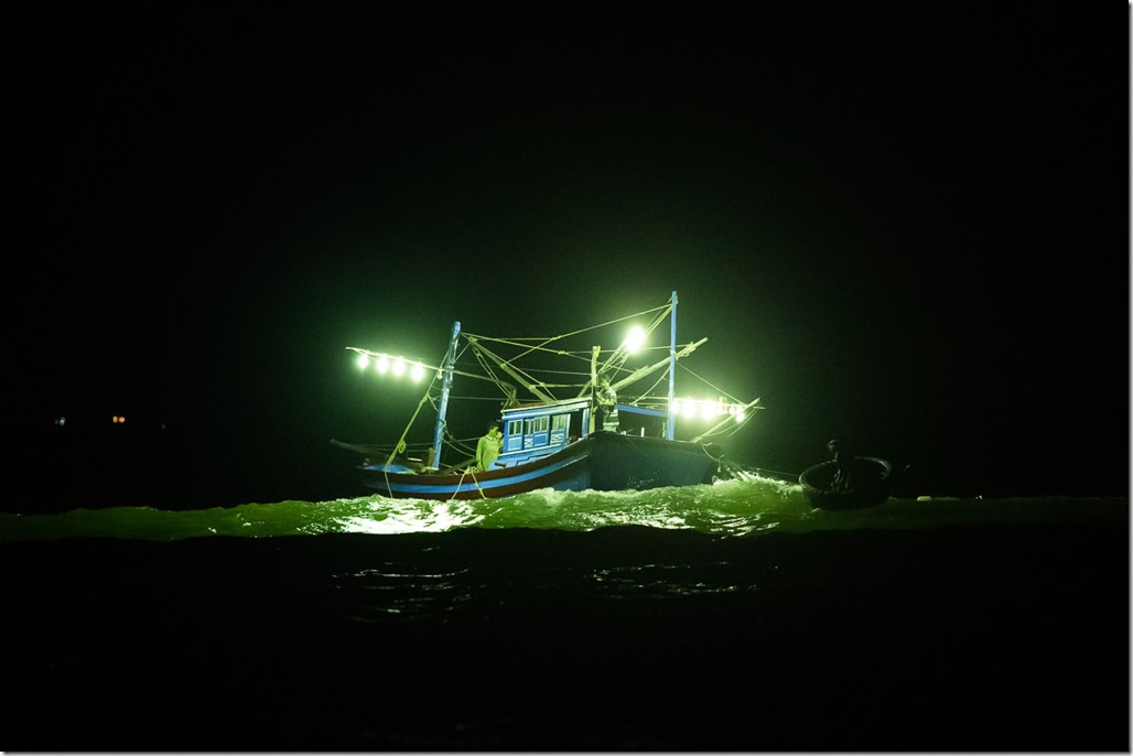 Irgendwann wurde es dunkel und dann konnte man die unzähligen Fischerbote, die sich wie eine Perlenschnur auf dem Meer aufreiten, besser sehen. Dank dem ganzen Foto-Gear, dass ich über den Strand mitgeschleppt hatte, gib es nun auch ein Detail-Foto. Erwähnenswert ist das runde Beiboot, das zwar rein strömungstechnisch nicht die beste Figur macht, dass man aber leicht an Land rollen kann. Davon sehen wir morgen bestimmt noch mehr.