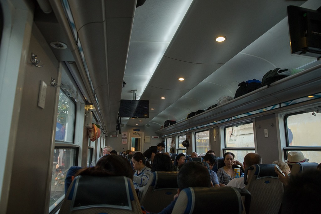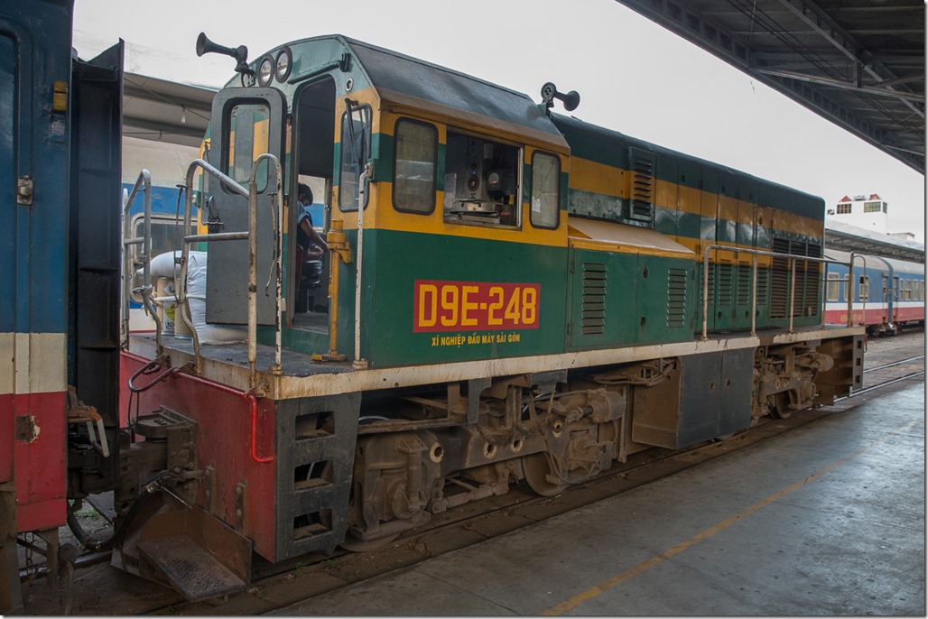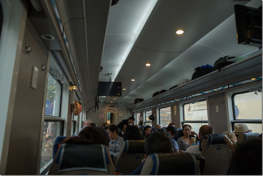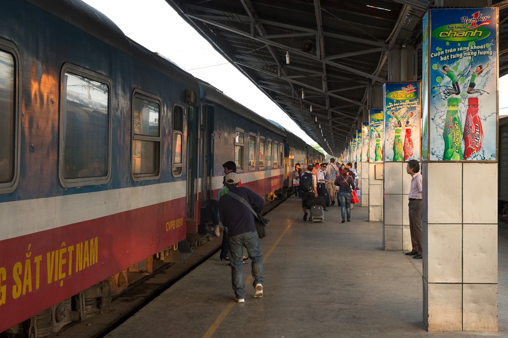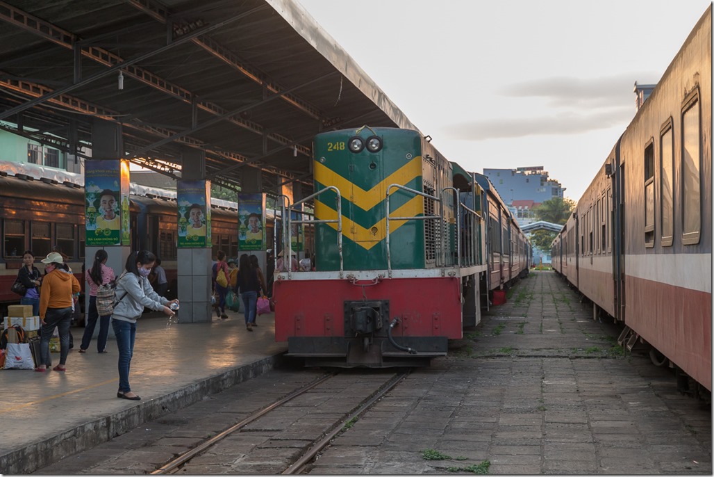 Von Saigon ging es heute um 06:50 mit dem Zug nach Phan Thiet, das am Meer liegt. Wir hatten die Fahrkarten schon lange im Voraus über das Internet bestellt. Wir mussten nur das Hotel in Vietnam angeben, in das sie geliefert werden sollten. Man kann natürlich auch am Schalter eine Karte kaufen, dann riskiert man aber, dass,  wenn ein Zug voll ist, man nicht mit der gewünschten Verbindung fahren kann. Denn alle Plätze sind nur mit einer Platzreservation zu haben. Unser Zug war zwar nicht voll, aber wirklich viel Platz hatte es nicht mehr. Der Hauptbahnhof in Saigon hat um die 4-5 Gleise. Unser Zug stand auf Gleis 3 und war schon 30 Minuten vor der Abfahrt da.