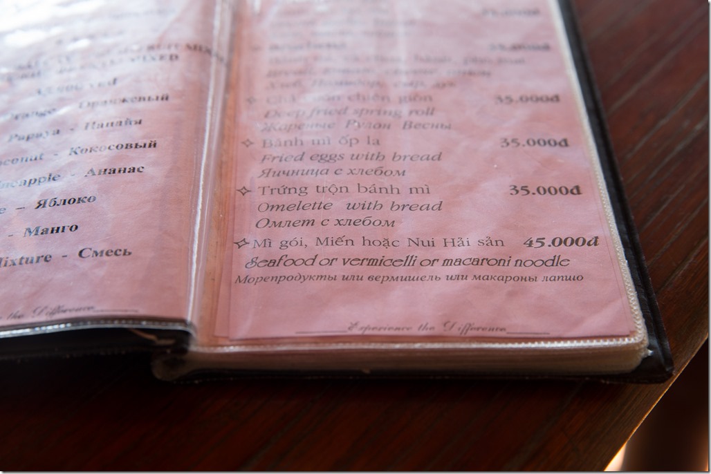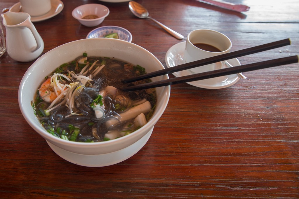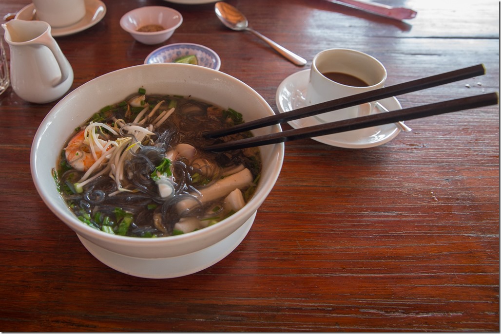 Wieder zurück im Hotel war der Hunger doch nicht mehr zu leugnen. Da hilft nur noch “Mi goi, Mien hoac Nui Hai san”. Hä? Klar doch! Meeresfrüchte-Nudelsuppe und die sieht wie folgt aus: