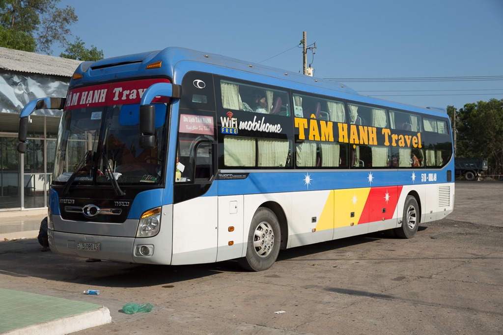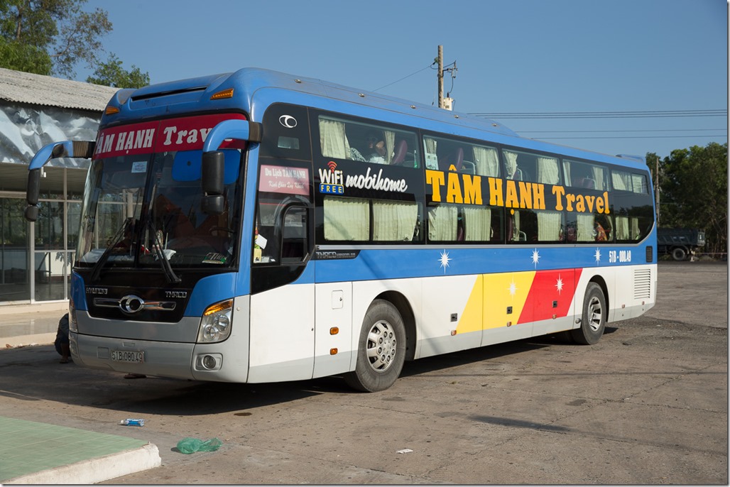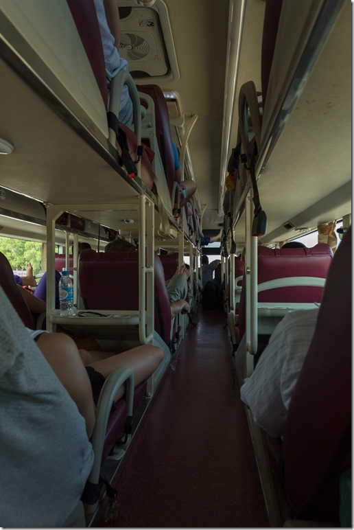 Gestern hatten wir ja schon den Bus nach Nha Trang gebucht, inklusive Abholservice vor unserem Hotel und das für gerade einmal 7 $ pro Person bei einer Fahrzeit von 4-5 Stunden. Da bekommt man etwas fürs Geld. Mit etwas Verspätung kam dann auch der Bus. Es handelt sich dabei um einen “Open Tour” Bus, einer gängigen Transportform die von privaten Unternehmen betrieben wird und die wichtigsten Stecken bedient. Unser Hotel lag am Rande von Mui Ne und so waren wir die letzten die Zustiegen. Es hatte genau noch zwei Plätze frei. Wenn man von Platz und Bus redet denkt man an einen SITZ-Platz. Richtig? Fehlanzeige!