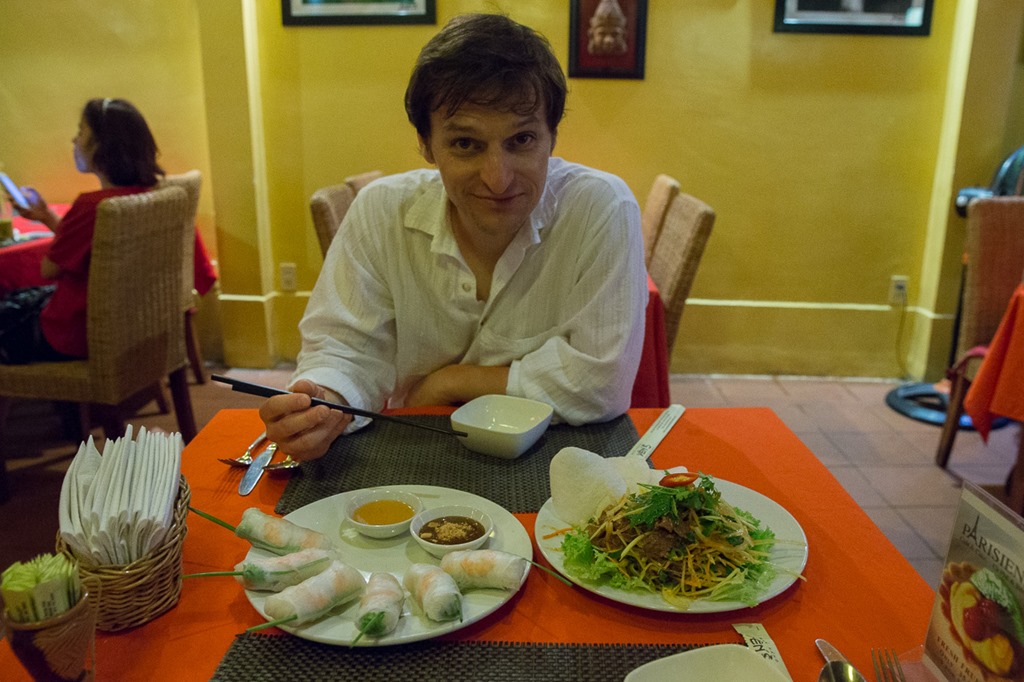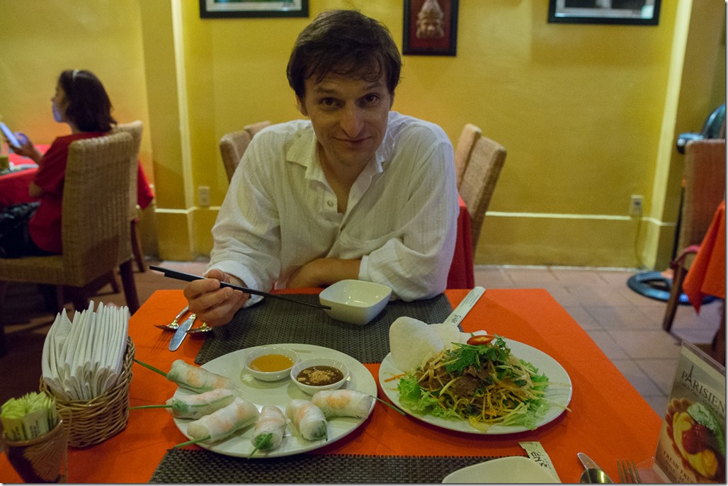 Nach dem kleinen Intermezzo mit dem Hotel ging es sofort los Richtung Nachtessen. Zum ersten Mal wählten wir ein Lokal aus meinen Vietnam-Führer, das zufälligerweise gleich um die Ecke lag. Zu sehen ist hier die Vorspeise aus Vietnamesischen Irgendwas-Rollen(nicht frittiert) und eine Papaya-Salat. Dar Rest war auch super und ausreichend.