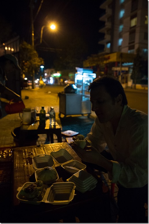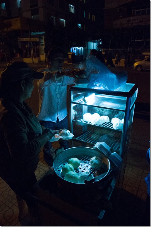 Ausreichend sagte ich eben. Auf unserem nächtlichen Spaziergang stiessen wir aber auf einen Stand mit irgendwelchen Teigtaschen und da ich diese noch nicht probiert hatte mussten ich gemäss Hausi unbedingt welche davon kosten. Wie gut die Verkäuferin war, zeigt die Tatsache, dass wir schlussendlich vier Teigtaschen kauften. Als wir uns dann noch entschieden, sie gleich in ihrem improvisierten Straßencafé zu essen war ihr Glück grenzenlos und wir bekamen gleich noch Tee spendiert. Grundsätzlich waren alle fein, aber die Fleischigen etwas deplatziert nach dem üppigen Nachtessen. Viel besser gefielen mir diejenigen mit einer Cocos-Streusel-Füllung. Super als Dessert!
