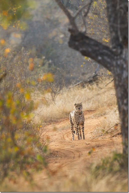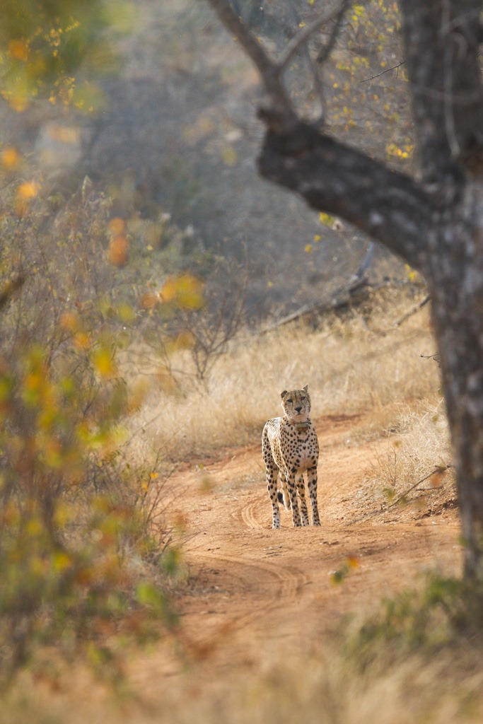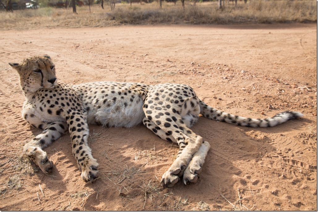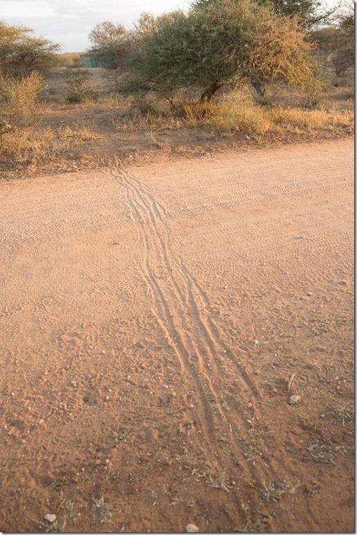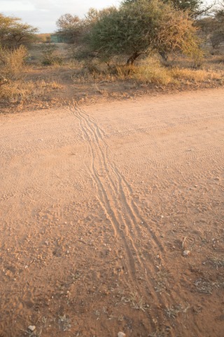 Bis 12:00 hatten wir heute nochmals Zeit, im Tschukudu Game Reserve etwas zu unternehmen. Danach ging es weiter zur letzten Lodge unserer Reise, der Forest Lodge in der Nähe des Flughafens. Nachdem unsere Guides die Möglichkeiten diskutiert hatten, entschlossen wir uns, mit den beiden Geparden “Hunters” und “Floppsy”jagen zu gehen. Das tönt zwar irgendwie komisch, ist es aber in Wirklichkeit gar nicht. Wie ich schon erwähnt habe, müssen die beiden fürs Futter selber sorgen. Das heisst, dass sie alle paar Tage etwas fangen müssen. Wenn man sie also bei ihren Streifzügen begleitet, stehen die Chancen gut, dass man eine Jagd beobachten kann. Nun gut, es brauchte einiges an Überzeugungskraft von dem Tschukudu Guide, dass sie überhaupt aus ihrem Gehege, in dem sie nachts meist schlafen, heraus trotteten. Irgendwie waren sie (noch) nicht in richtiger Jagdlaune oder der Magen war noch zu voll. Etwa 100 Meter von der Lodge entfernt trafen wir auf diese Schleifspuren. Sie wurden von einem Leoparden hinterlassen, der in der letzten Nacht ein Tier, vermutlich ein Impala, am Wasserloch in der Nähe gerissen hatte, und nun seine Beute auf einen Baum transportiert hat. Wären wir nicht mit dem beiden Cheetah unterwegs gewesen, hätten wir diese Spur verfolgt. Im Auto natürlich, denn am Ende einer solchen Spur hat es meist ein Raubtier 🙂