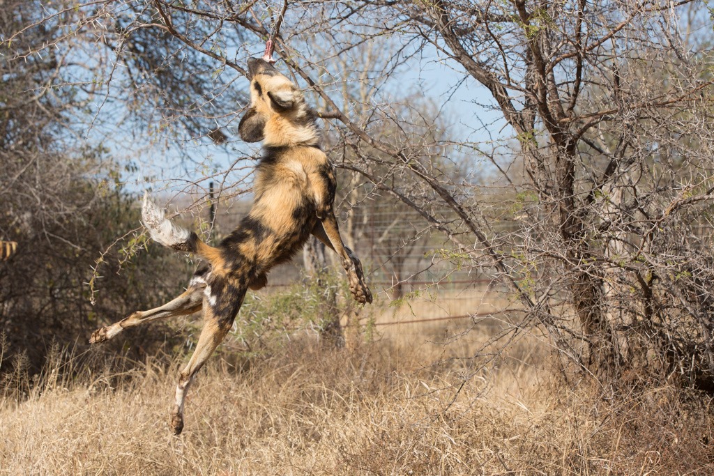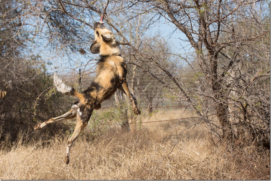 Dingo ist ein Wildhund. Er war hier aufgenommen worden, nachdem man ihn mit einem gebrochen Bein in der Wildnis gefunden hatte. Offenbar scheint dieser Verletzung aber gut geheilt zu sein. Denn er springt wie wild nach dem Büffelfleisch.