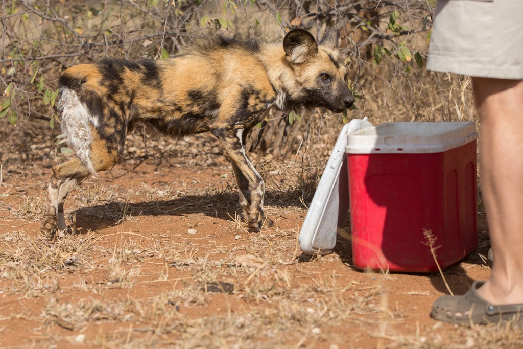 Nachdem wir uns von ein paar Helmperlhühner im Nachbargehege ablenken liessen, entschloss sich Dingo zu einer einfacheren Nahrungsaufnahme direkt aus der Kühlbox …
