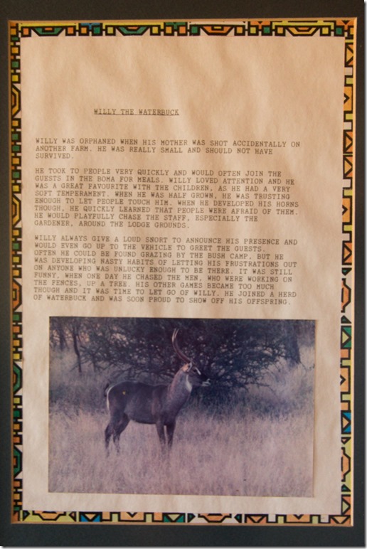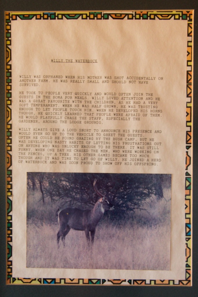 Und hier ist seine Geschichte, die Kurzversion: “Als Waise wurde er aufgenommen und war sehr zutraulich. Als er erwachsen wurde entwickelte er aber schlechte Manieren und verfolgte z.B. den Gärtner mit seinen Hörnern. Dann wurde er in die Freiheit entlassen wo er sich einer Herde Wasserböcke anschloss und später mit seinem Nachwuchs angab.”