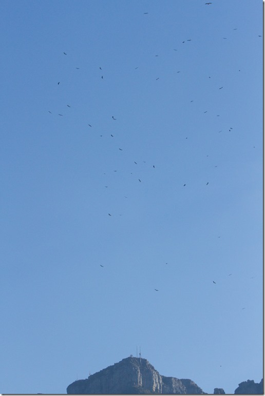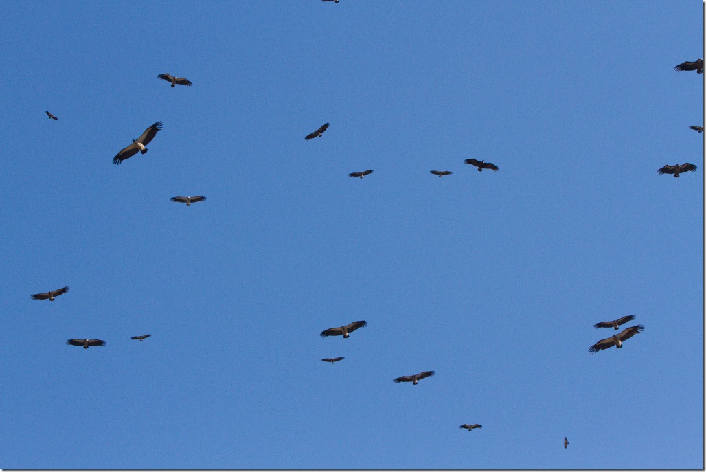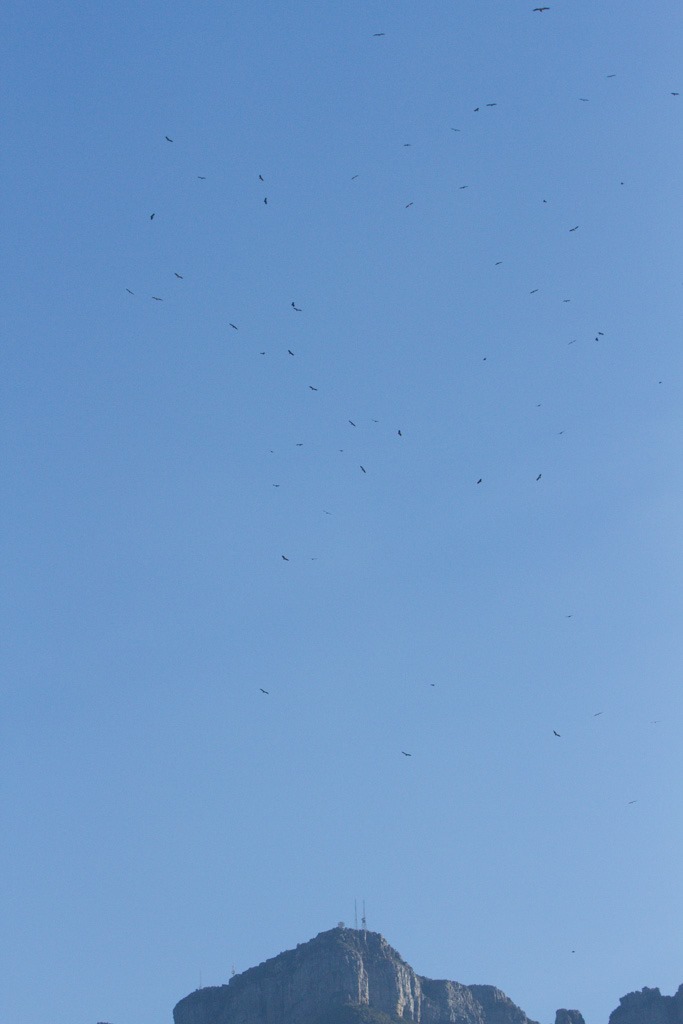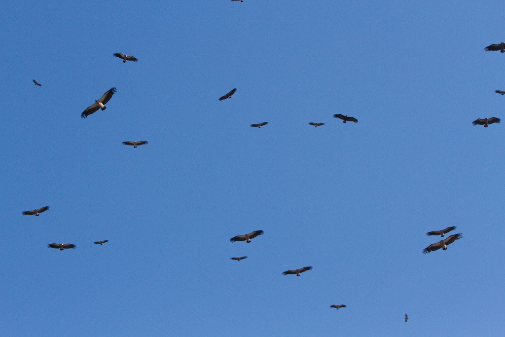 Hoch oben ziehen sie noch ihre Runden. Es sind viele, extrem viele. Ein Versuch, sie zu zählen, scheitert. Es sind aber mindestens 150 Geier.