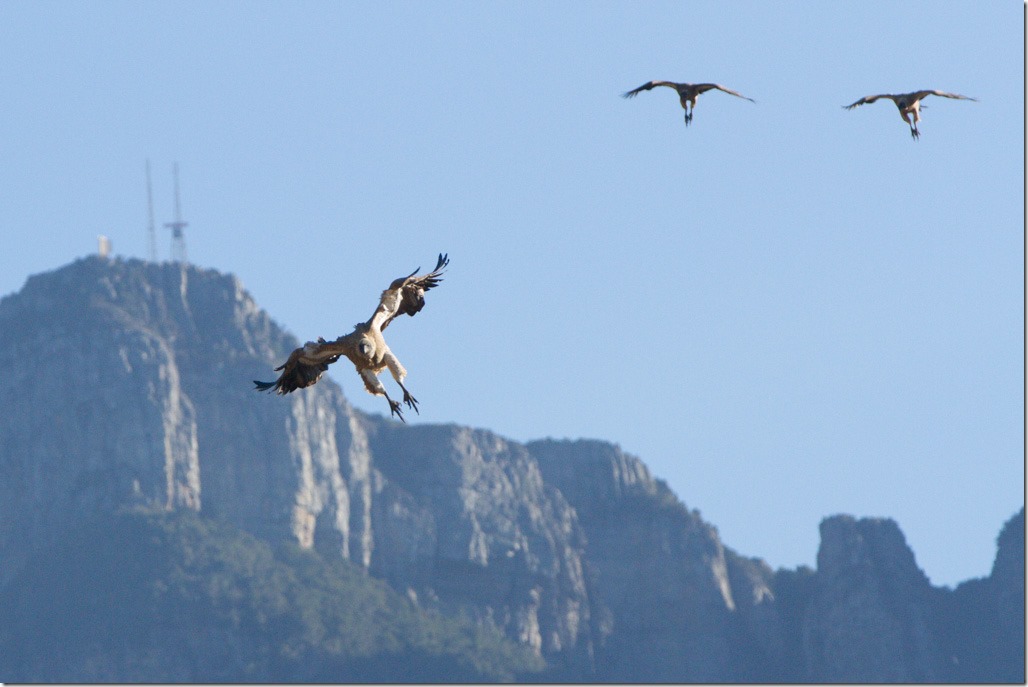 Im Endanflug, rein ins Chaos! Wer zu spät kommt, der bleibt hungrig. Ein Marabu macht sich rechts in sicherer Entfernung noch Hoffnungen, dass etwas übrig bleibt.