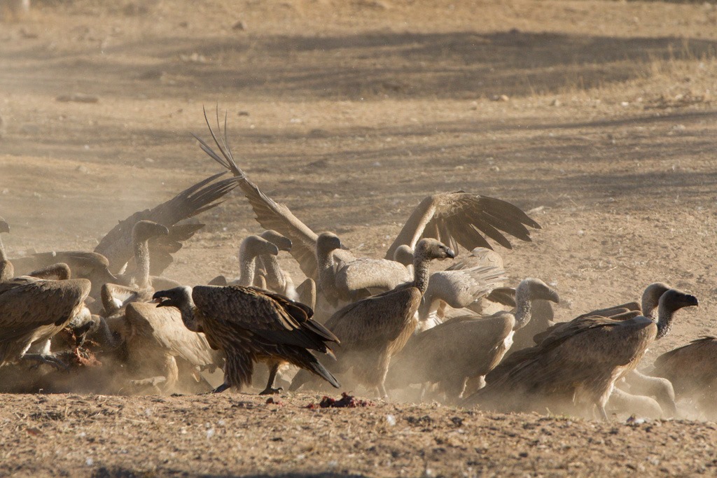 Während die einen Geier sich gleich wieder in die Höhe schrauben, ruhen sich andere auf den Bäumen in der Umgebung zuerst einmal aus.