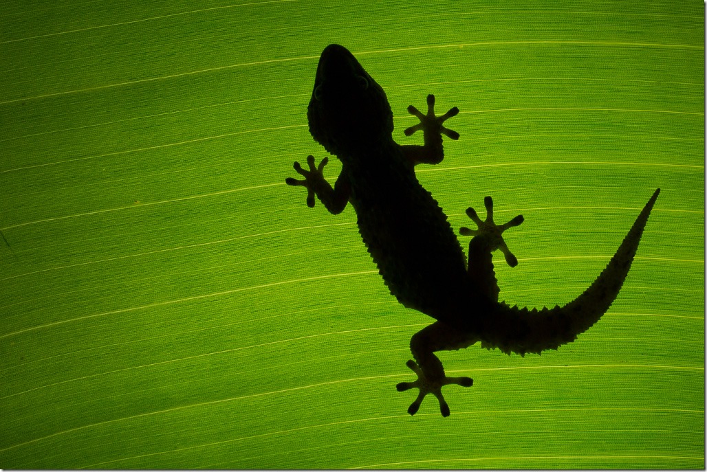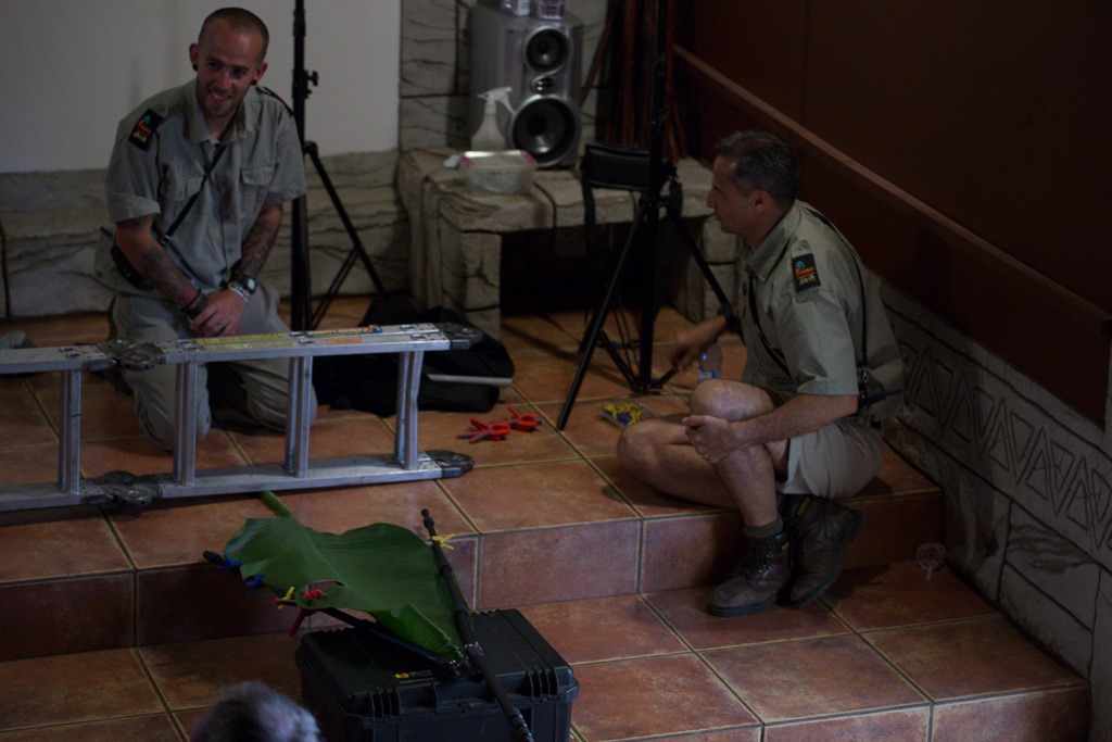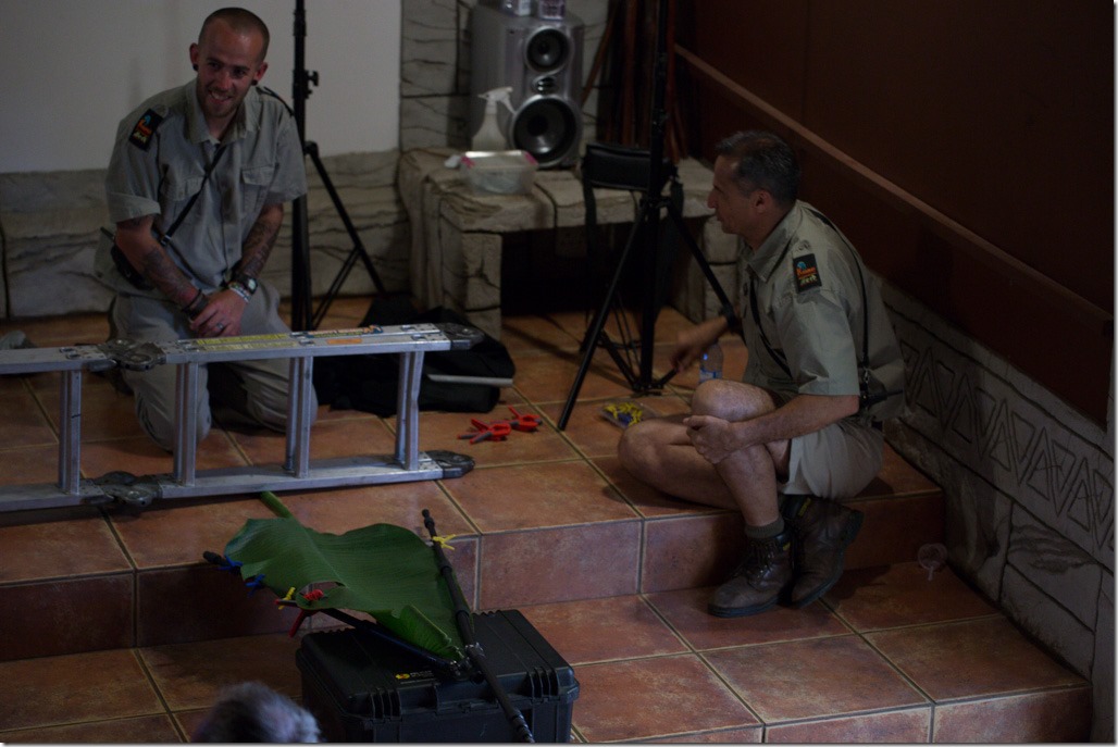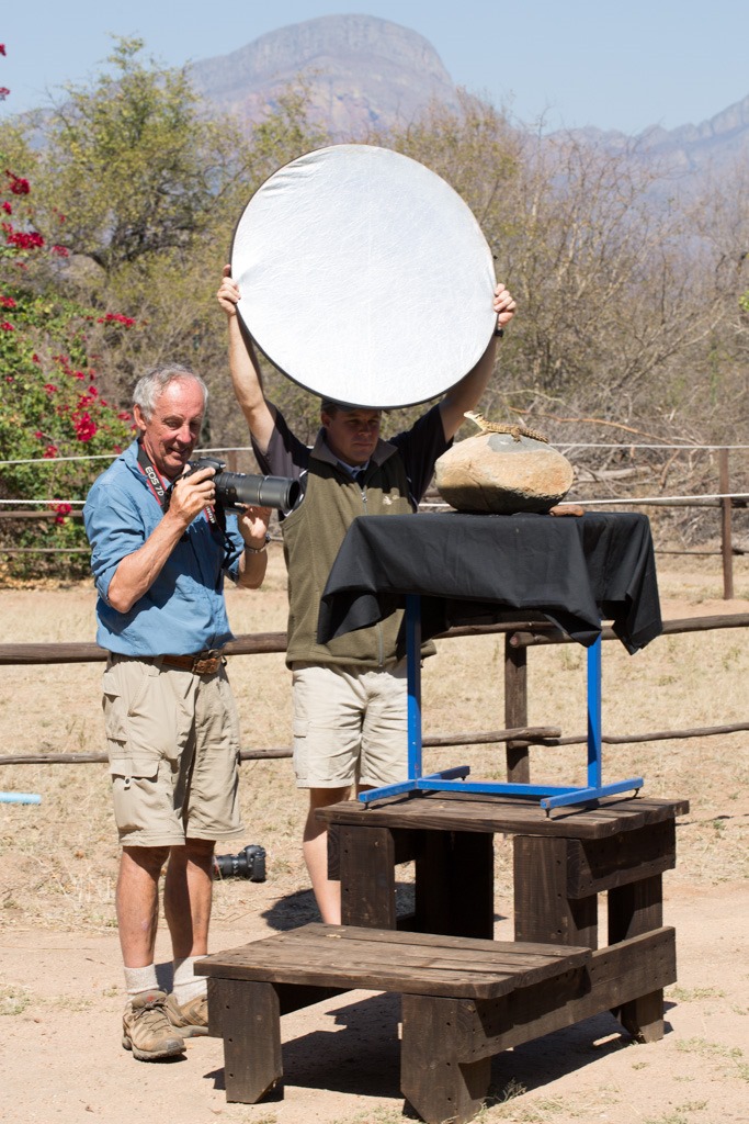 Schon die “Grüne Mamba” fühlte sich in der prallen Sonne nicht lange wohl und versuchte schon nach kurzer Zeit, von unserem kleinen Foto-Baum in den Schatten zu gelangen. Deshalb beschlossen wir spontan das Set zu wechseln und Bauten eine Einstellungen mit einem Gecko auf. Hier sieht man unseren improvisierten Aufbau und die beiden Wärter, die uns den ganzen Tag begleitet haben. Ein Gecko, den sie am Morgen eingefangen hatten wurde auf einem Blatt platziert und mit einem Blitz von unten belichtet.