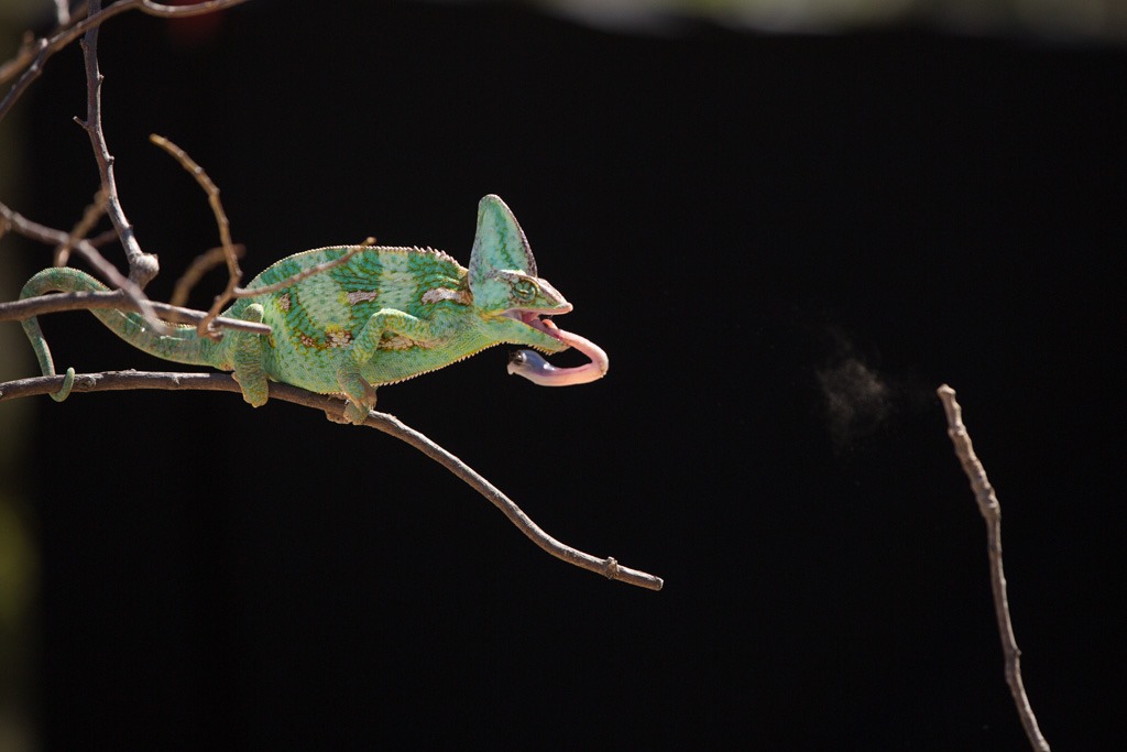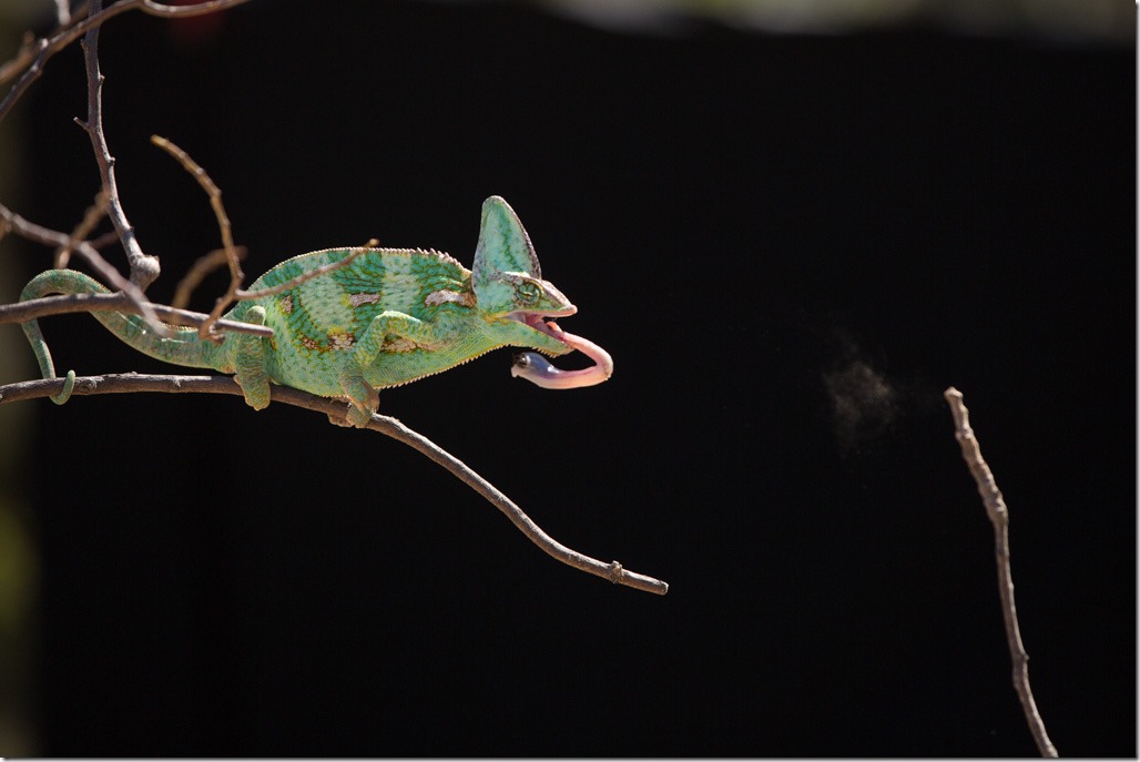 Die Fütterung zu fotografieren war entsprechend schwierig. Der ganze “Zuge-raus-rein” Vorgang dauert nur rund 0.2s und wird selbst mit unseren Kameras zum Glückspiel. Auf diesem Bild kann man die Zunge schon auf dem Rückweg sehen.