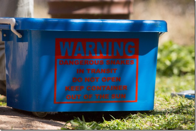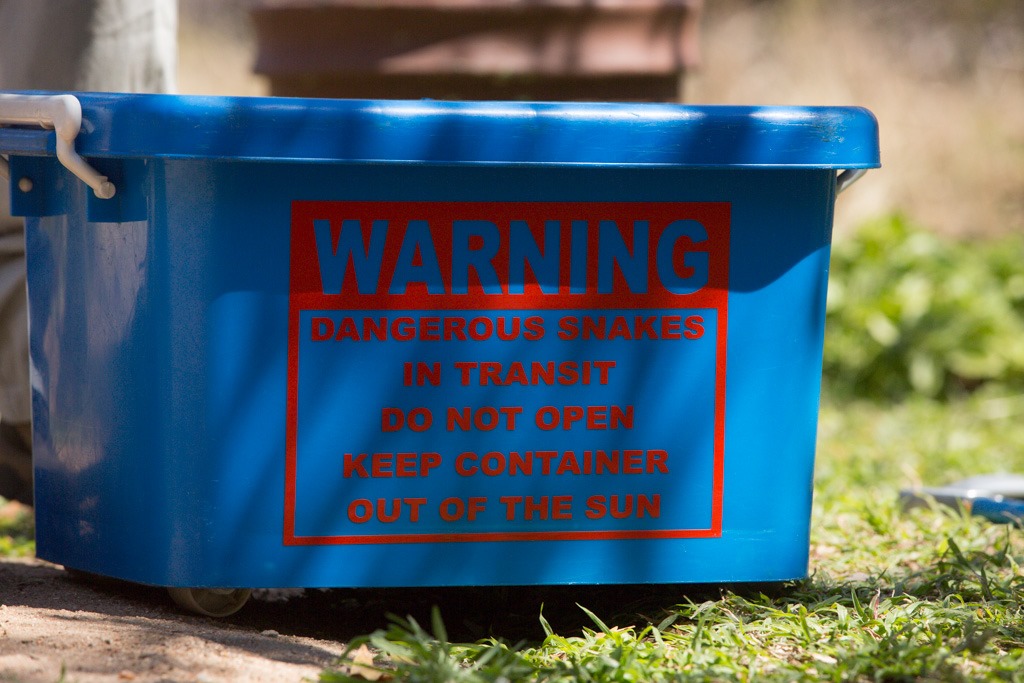 Nun war die “Snouted Cobra” an der Reihe. Dazu sperrten wir den Parkplatz ab und platzierten sie ein einer kleinen Hütte. Nachdem sie sich von den Manipulationen beruhigt hatte, nahm der Wärter die Hütte weg