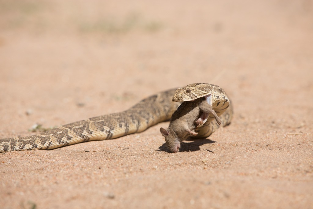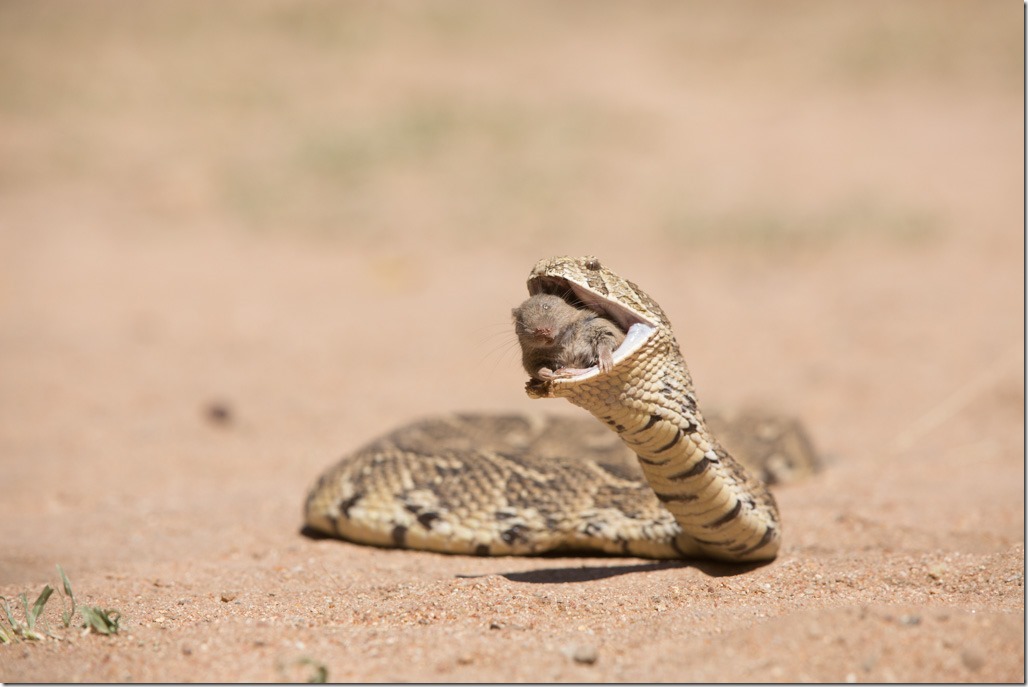 Die Maus schien sich mit ihrem Schicksal abgefunden zu haben. Es dauerte keine 5 Minuten und schon war die Maus verschwunden. Noch ein Wort zur Maus: In Südafrika dürfen aus “humanitären” Gründen keine lebendigen Tiere an andere Tiere verfüttert werden. Deshalb war die Maus auch schon tot und der Wärter des Zentrums musste einiges an Überzeugungsleistung aufbringen bis die Puffotter die Beute auch fressen wollte.