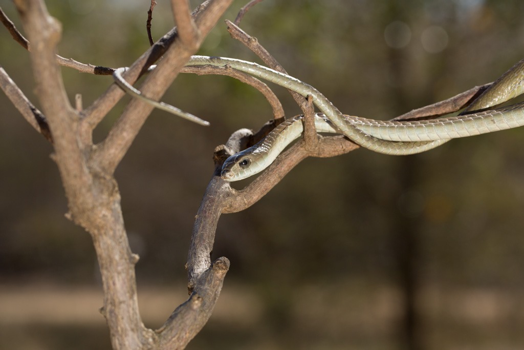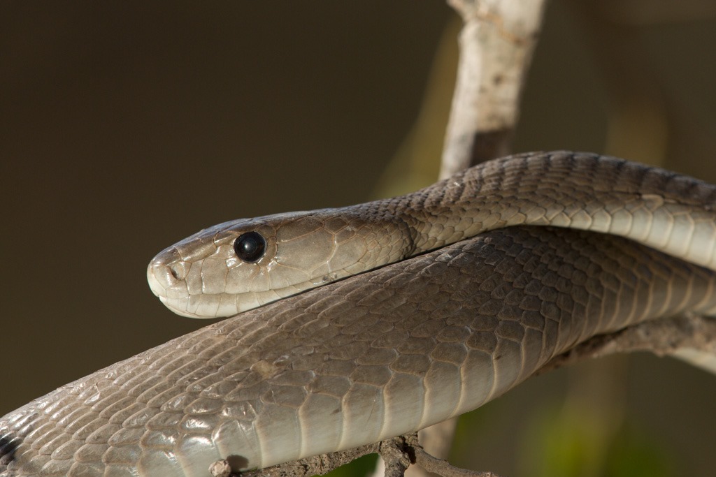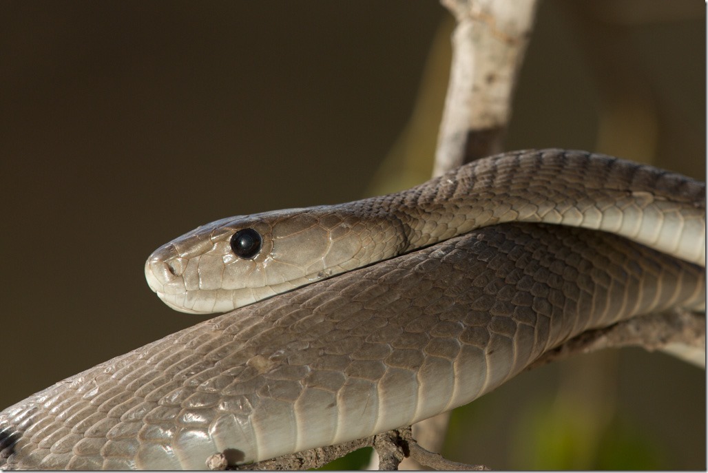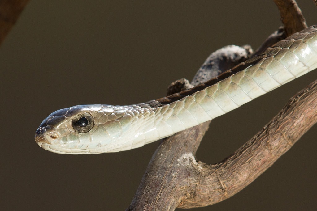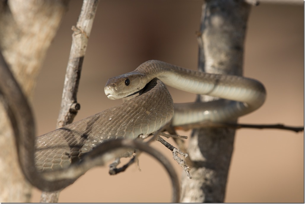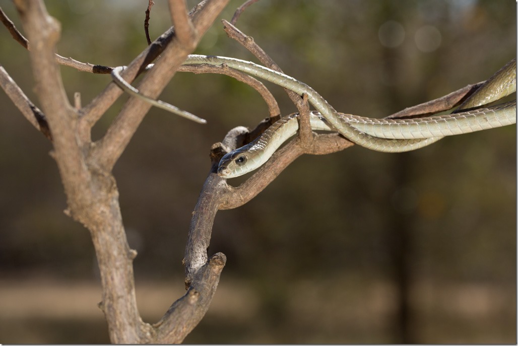 Nach dem Gecko ging es zurück zu den Schlangen. Die “Black Mamba” – “Schwarze Mamba” war angesagt. Sie können sich sehr schnell fortbewegen, bis zu 20 km/h über kurze Strecken, und werden bis zu 3 Meter lang. Den Namen haben sie nicht von ihrer Farbe sondern vom schwarzen Rachen. Leider öffnete dieses Exemplar den Mund nicht für ein Foto und ich hatte auch nicht vor sie dazu zu animieren, gilt doch ein “Black Mamba” Biss als potenziell eine der gefährlichsten.