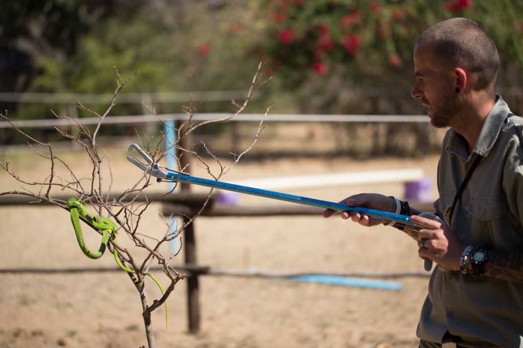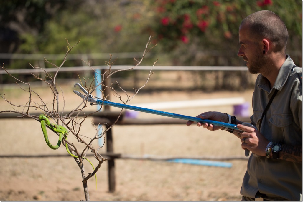 Nach dem Mittagessen waren wieder Schlangen an der Reihe. Die erste war eine “Boomslang” [buˑomslʌŋ], was auf Afrikaans/Holländisch soviel bedeutet wie Baum-Schlange. Und dort platzierten wir sie auch.