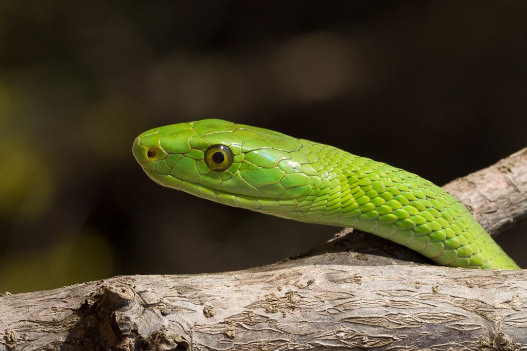 Man könnte wie eben erklärt nun folgern, dass die nächste Schlange eine männliche Boomslang ist. Dem ist aber nicht so, es handelt sich nämlich um eine “Grüne Mamba”. Hier ein Grössenvergleich.
