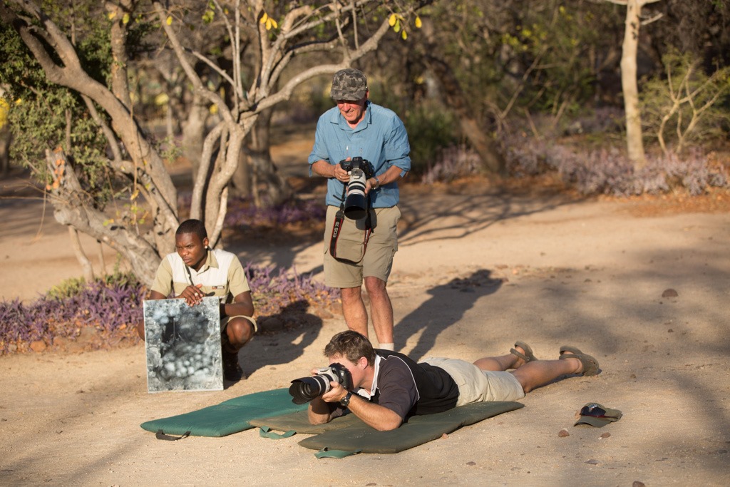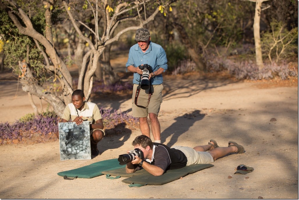 Zum besseren Verständnis: So sah unser Aufbau aus. Der Fotograf, David aus Australien, dahinter Stu unser Guide, der sicherstellt, dass das Sonnenlicht auf dem Reflektor richtig gespiegelt wird und ganz klein der Sungazer auf dem Stein.