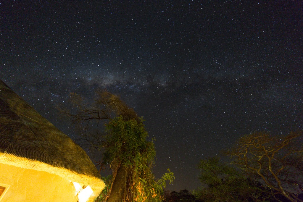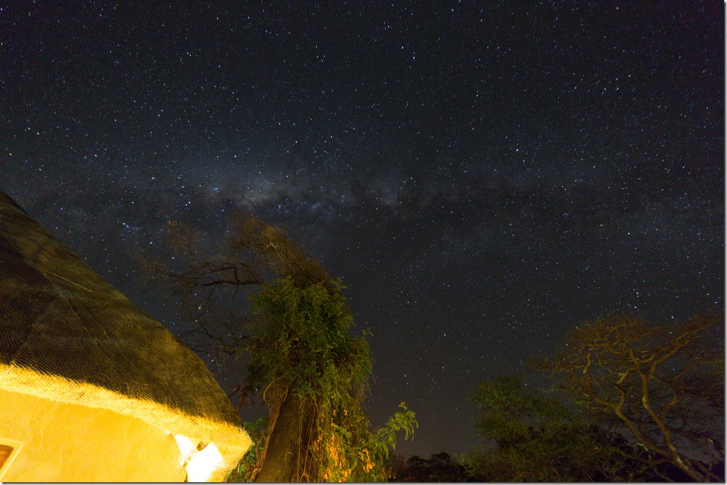 Abends versuchte ich mich noch etwas mit Nachtaufnahmen. Da es im Park um die Lodge auch Leoparden gab, war es ratsam, in der Nacht nicht zu weit vom Haus wegzugehen. Deshalb hier eben eine Aufnahme mit dem Haus.