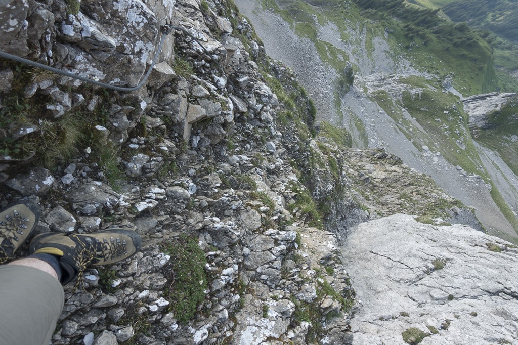 There are a couple of sections on the way up where it is highly advisable to not do a wrong step or slip. Gravitational forces would do bad things with you … But as the rock is very solid with many good places for you hands this is not a problem at all.