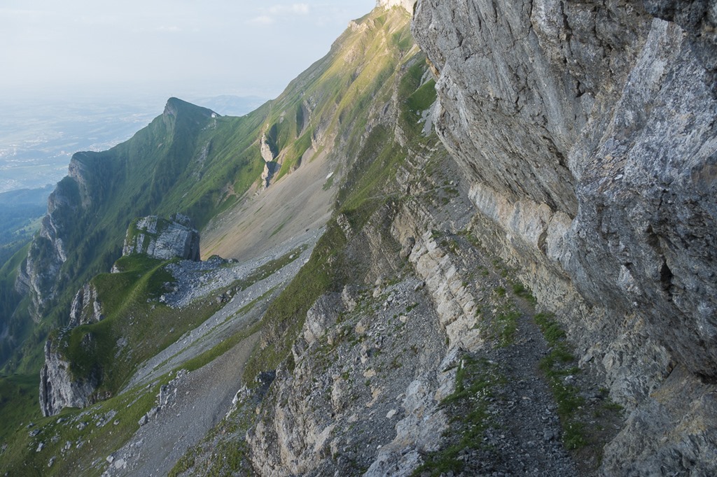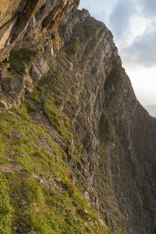 At this point the clearly visible trail was going down and there was no obvious way of how to continue close to the rocks. No, this can not be the end, I thought. It looks again pretty doable with no real steep cliffs to the left. Again, as I had sunset closing in, I didn’t have unlimited time to try out things. So I decided to continue until I would reach the visible grass section and could check how the situation is behind. There I would have to make a decision to abort or continue.