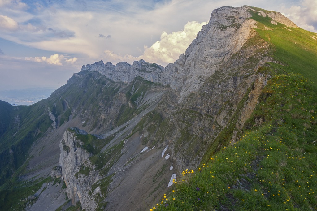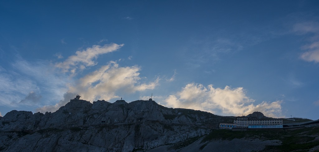 After reaching Pilatus I immediately continued with the Esel Loop. Still 45 minutes to go until sunset and I wanted to be back on the top by then. The following picture is looking back up to the buildings on Pilatus on the short descent around the Esel mountain.