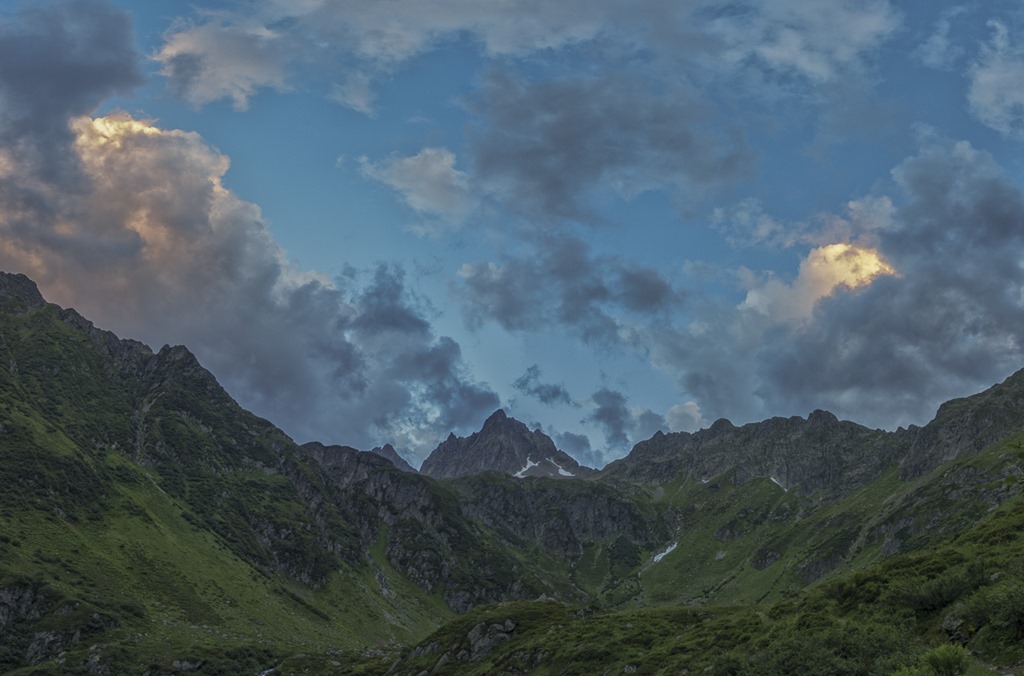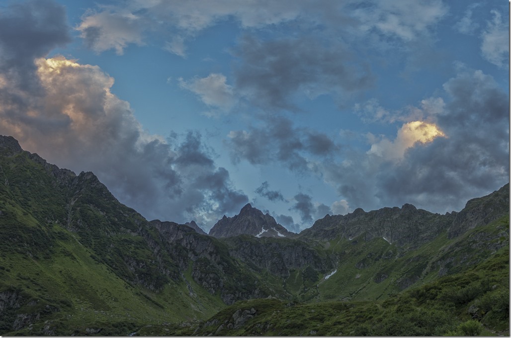 As the weather was kind of uncertain I started rather late at 05:15. So when the sun was rising I was still far down in the valley. But I already got a nice glimpse onto today’s target, the Mäntliser. And it is obvious: This is the king of the valley …