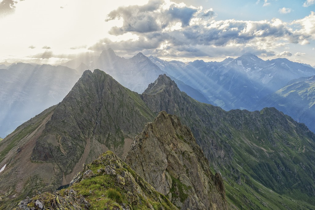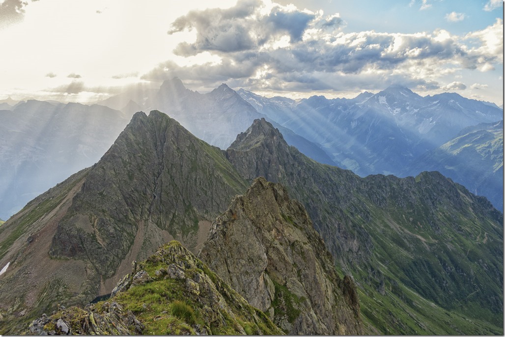 Once I reached the ridge which was leading to the Ruchen mountain I had a short first break. The view was already very nice, particular with the rays of the sun stretching out over the mountains. The following picture shows the first mountains o the Leutschach Valley: Jakobiger and Ruchälplistock