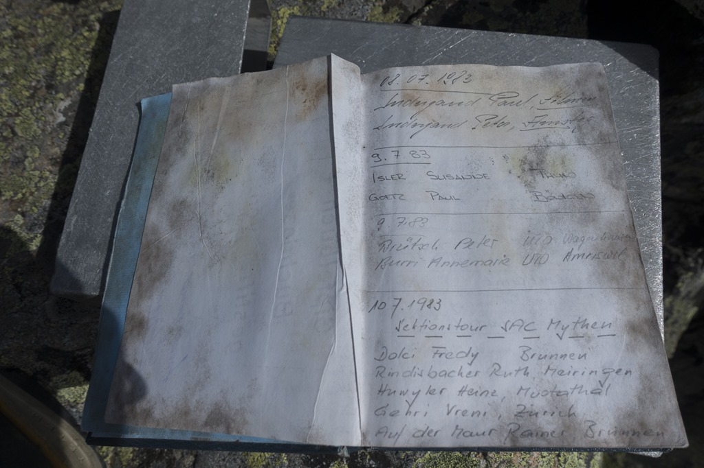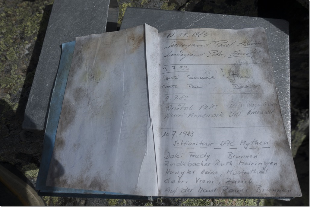 The “summit book” of Mäntliser is the oldest I have every seen. The first entry is from 1983 and there are still some pages free in the back. Obviously not too many people are coming up here. And most of them are actually climbers doing the South-East wall.