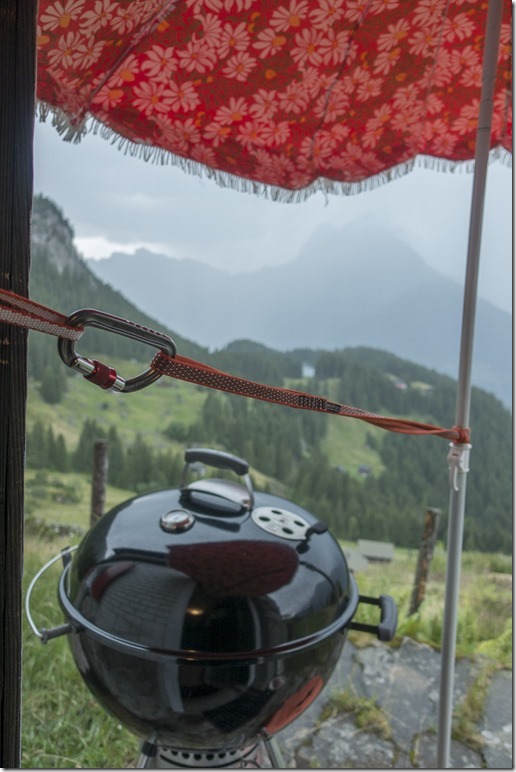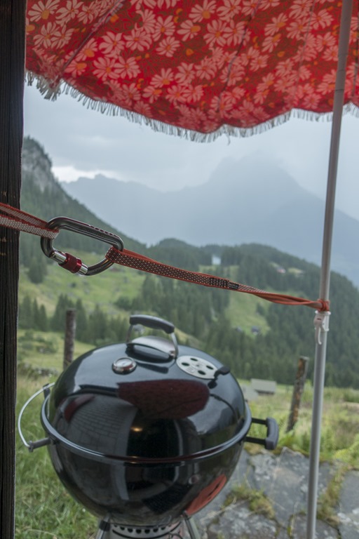 During the whole day I was carefully watching what the weather was doing. The forecast predicted some thunderstorm for late afternoon. And you definitely don’t want to get stuck in such a thing in the mountains. Three hours after I had returned to my hut the thunderstorm started as predicted but nevertheless caught me a little off guard as I just had started to prepare the fire in my grill. Luckily I had enough mountain security gear with me in order to protect the grill from the rain.