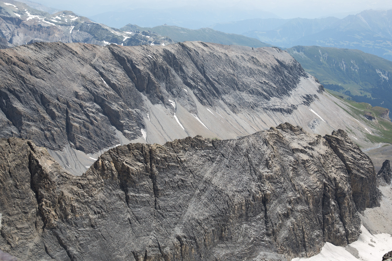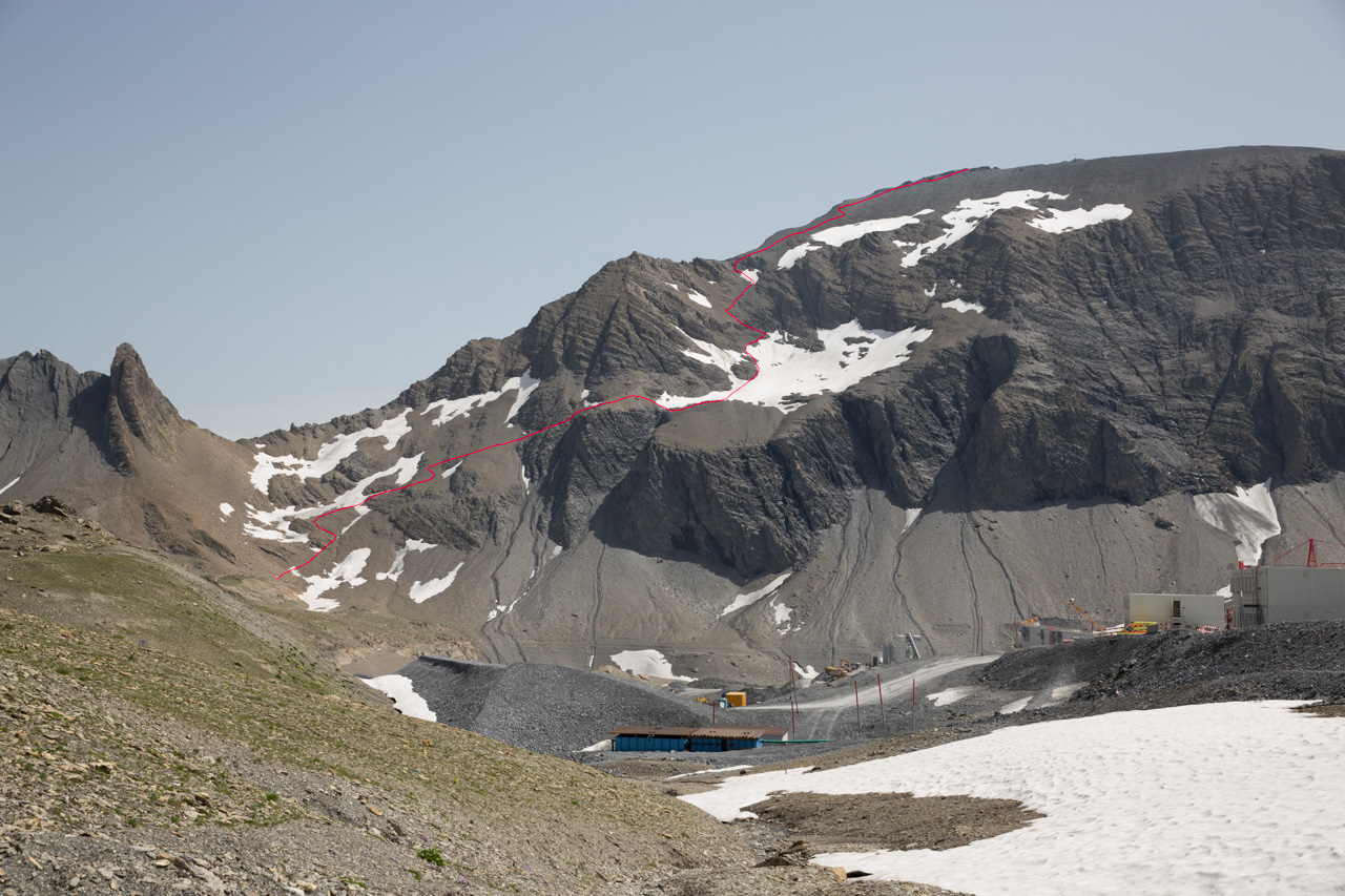 Und hier umgekehrte Sicht vom Ruchi auf die Baustelle. Der Aufstieg war zum Teil recht anstrengend, da man den Weg, sofern überhaupt vorhanden, von unten nicht so gut sieht und es neben dem Weg wegen des losen Schiefergesteins ein “zwei Schritt vor, ein Schritt zurückrutschen” gibt.