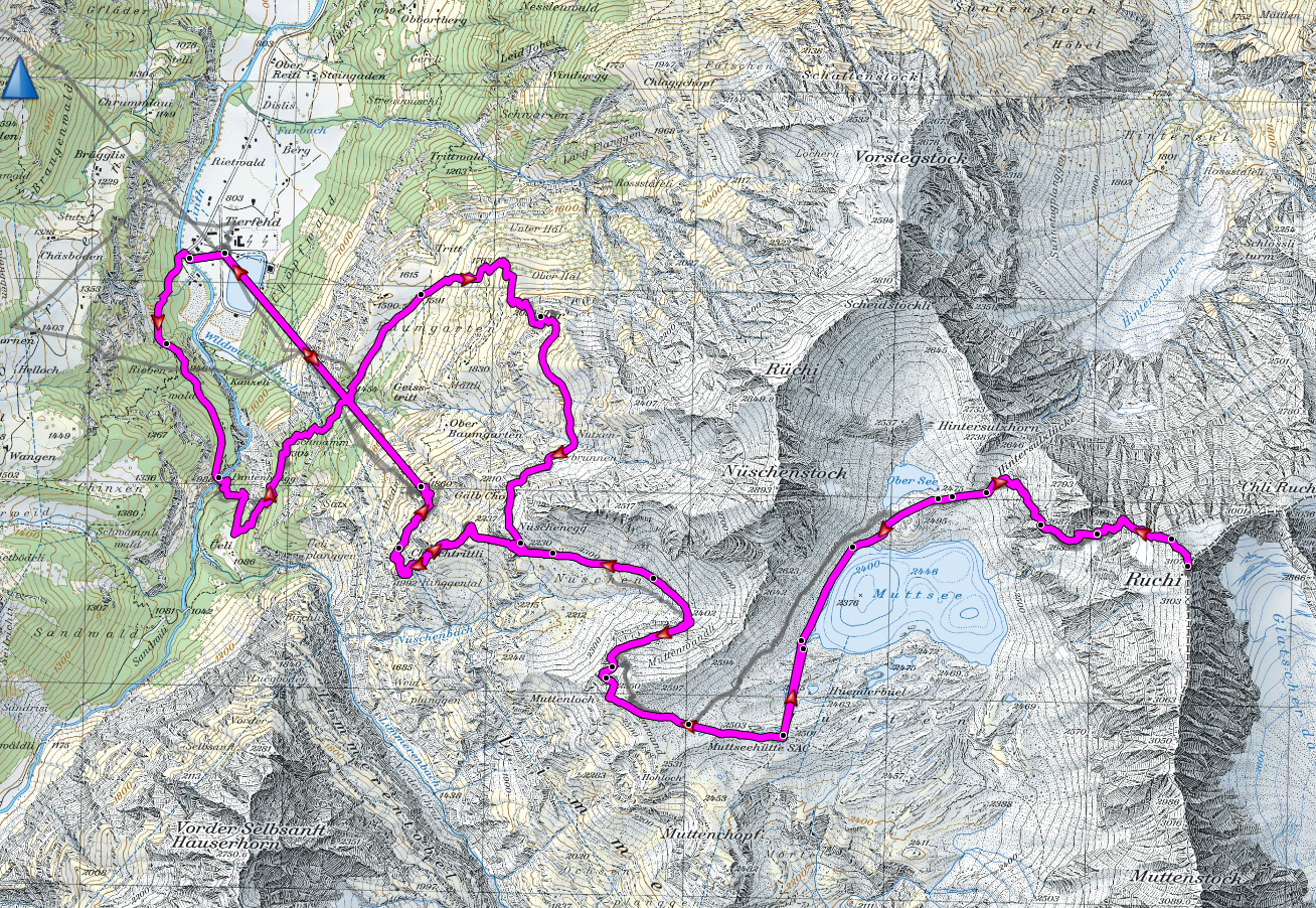 Hier sieht man den gesamten Weg. Ich hatte auch ein GPS-Logger dabei. Das hat aber wegen der vielen steilen Berge nur einen sehr ungenauen Track aufgezeichnet.