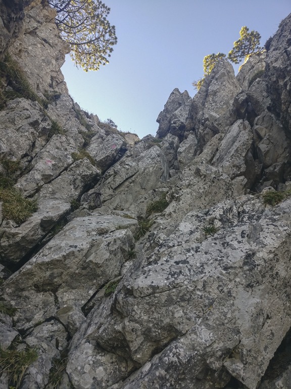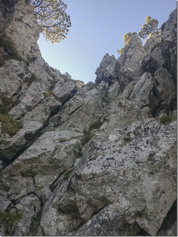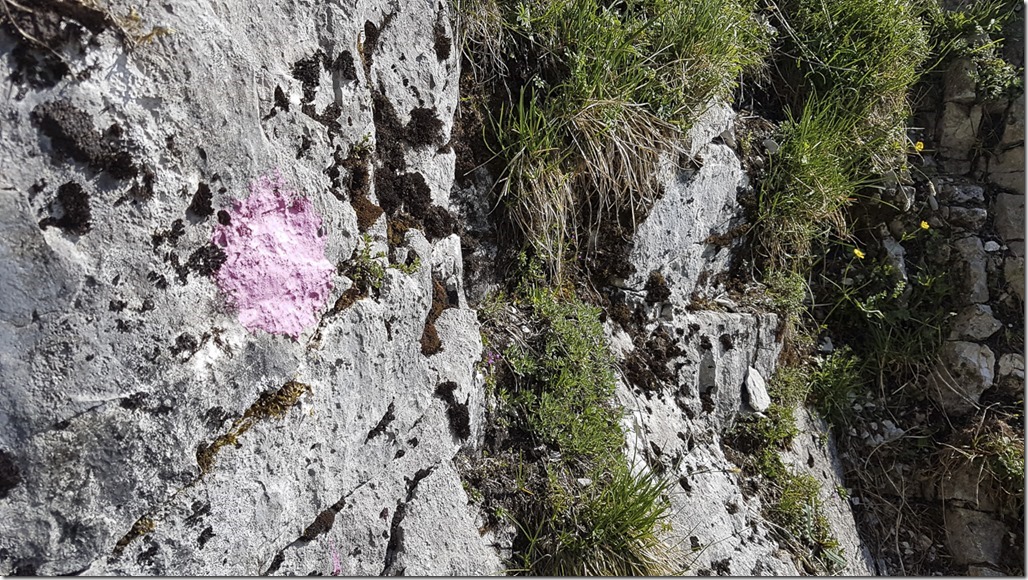 Heute hatte ich mir die Chalberstöckli-Route auf den Grossen Mythen vorgenommen, die mit einer Schwierigkeit von T6- bewertet wird. Als ich dann am Einstieg stand, war ich mir der Sache dann doch nicht mehr so sicher. Zu erwähnen ist, dass ich hier vor zwei Jahren beobachten konnte, wie die Rega aus dieser Route zwei Wandere ausflog, da sie offensichtlich in Schwierigkeit geraten waren. Nun gut, ich sah einen anderen Wanderer, der bereits ein gutes Stück auf diesem Weg nach oben unterwegs war und so machte ich mich auch los. Ich kann ja immer noch umkehren, wenn es zu “strub” wird. Bald schon stiess ich auf die ersten Markierungen. Hier hatte jemand wohl eine gewisse Vorliebe für pink gehabt.