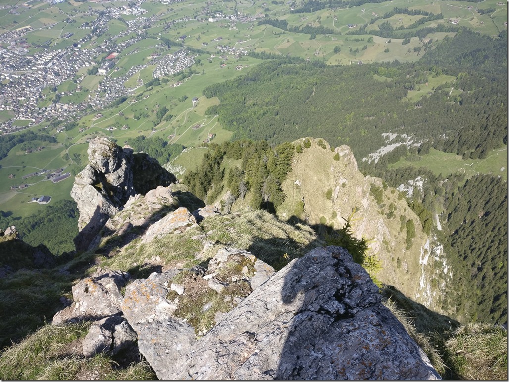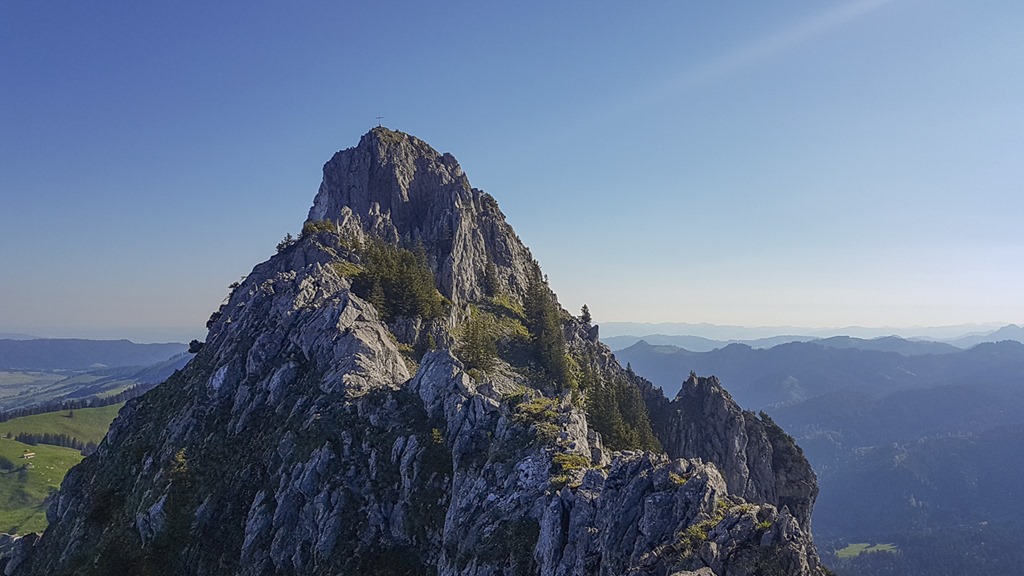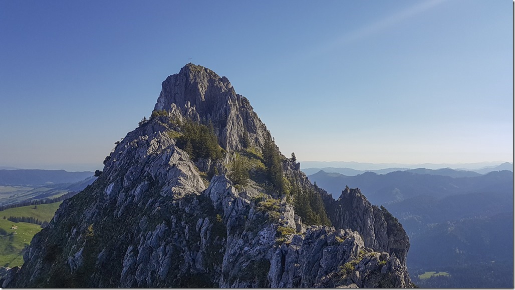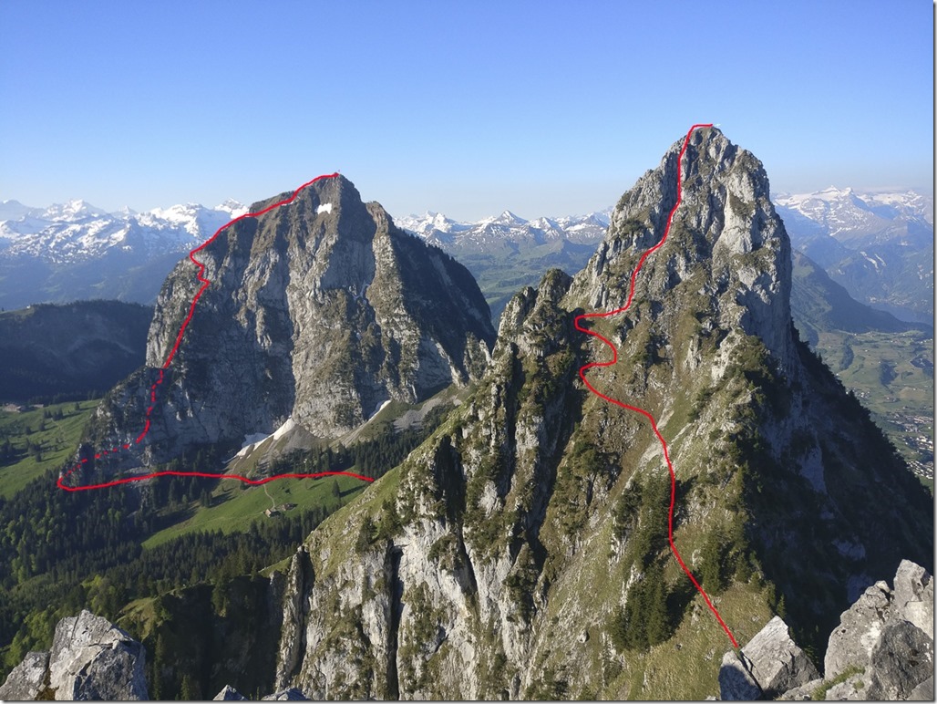 Blick vom Vorgipfel zurück zum kleinen Mythen. Er sieht aus dieser Perspektive deutlich schwieriger aus, als er in Wirklichkeit ist.
