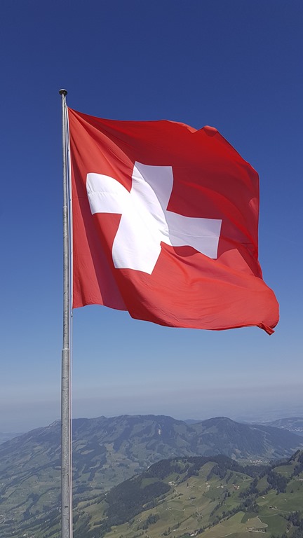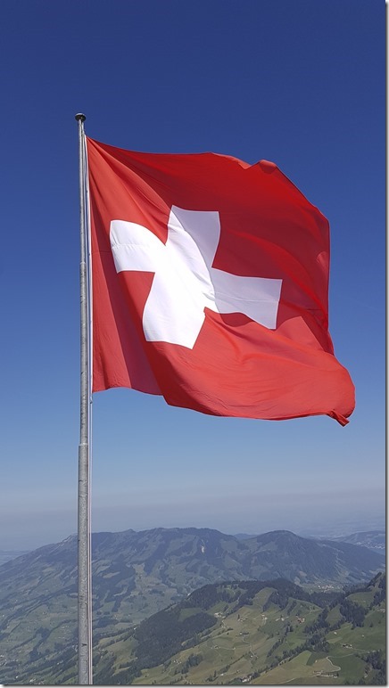 Die Schweizerfahne, die man selbst vom Tal aus deutlich sehen kann, aus nächster Nähe fotografiert.