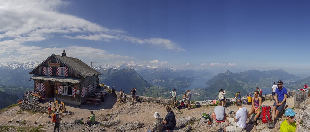 Das Restaurant hat bereits wieder geöffnet. Wie man auch sehen kann, sind schon zahlreiche Wanderer hier angekommen. An guten Sommertagen soll es angeblich weit über 200 Personen auf dem Gipfel haben. Das wäre fast schon Grund genug, den Wanderweg auf vier Spuren auszubauen, um irgendwelche Staus zu vermeiden.
