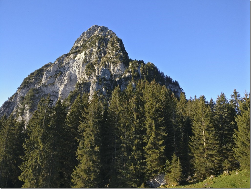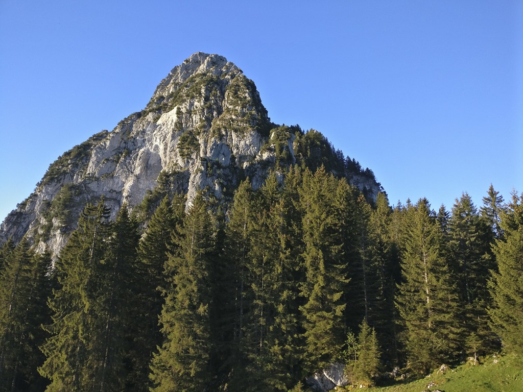 Die Geschichte vom Haggenspitz ist schnell erzählt: Auf zur Haggenegg, dort Schwung holen, dem Weg folgen, kraxeln, noch mehr kraxeln und oben ist man. Obwohl ich schon mehrfach hier war, könnte ich immer noch nicht auf dem Bild den genauen Weg einzeichnen. Irgendwo auf dem Grat, im Wald.