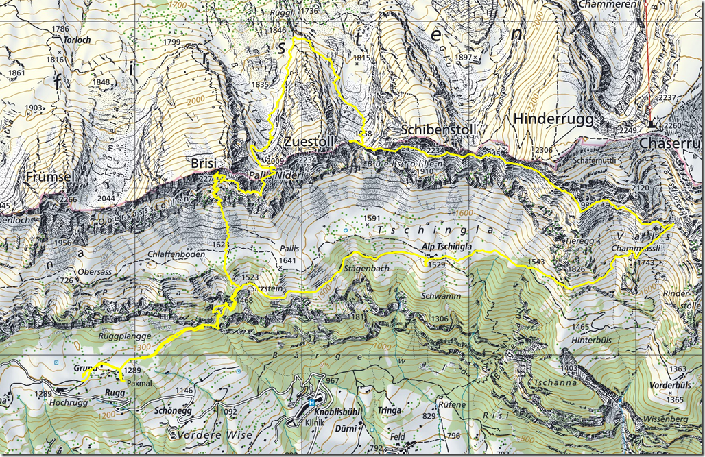After not having done anything meaningful for two weeks my body and mind was asking for something, something which makes the difference between a weekend to forget and something worth remembering.  As the weather hasn’t recovered from the “let’s do some occasional rain” mode I ruled out camping. Actually I considered camping as an option for a split of a second as with my tent the weather is pretty much irrelevant. But then again I am too old for camping in full out rain just for the fun of it not to mention that there was a chance that the rain could turn into snow at some point. On the other hand I was also too lazy to search all the guide books and come up with something new. So I went back to some of my favourite tours, but this time I would skip the camping and do it in one day: the Palis Nideri and Schnürliweg circle tour on the Churfürsten mountains.  Palis Nideri I have done a couple of times before, the Schnürliweg only once two years ago. I also wanted to scout some nice camping spots on the Alp Tschingla as this is the perfect spot if you don’t want to go further up with a perfect view of the Walensee lake.