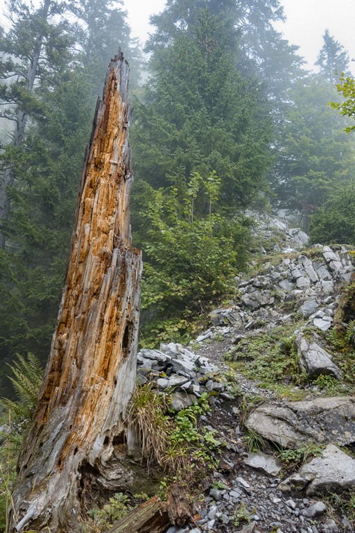 Last time I did this trail I was camping somewhere in this area. I remember that I had to get down quite a bit just to hike up the lost meters. Back then it was already dark and I was using my headlights. This time there was light and I decided I would not get down any unnecessary meter. So I started to find my way alongside the mountain. The bushes were quite high and at times the terrain quite steep. Later I had to admit to myself that going down and up would have been probably twice as fast. And there was another problem: Of course the bushes were wet from all the rain and so were my trousers after not too long…