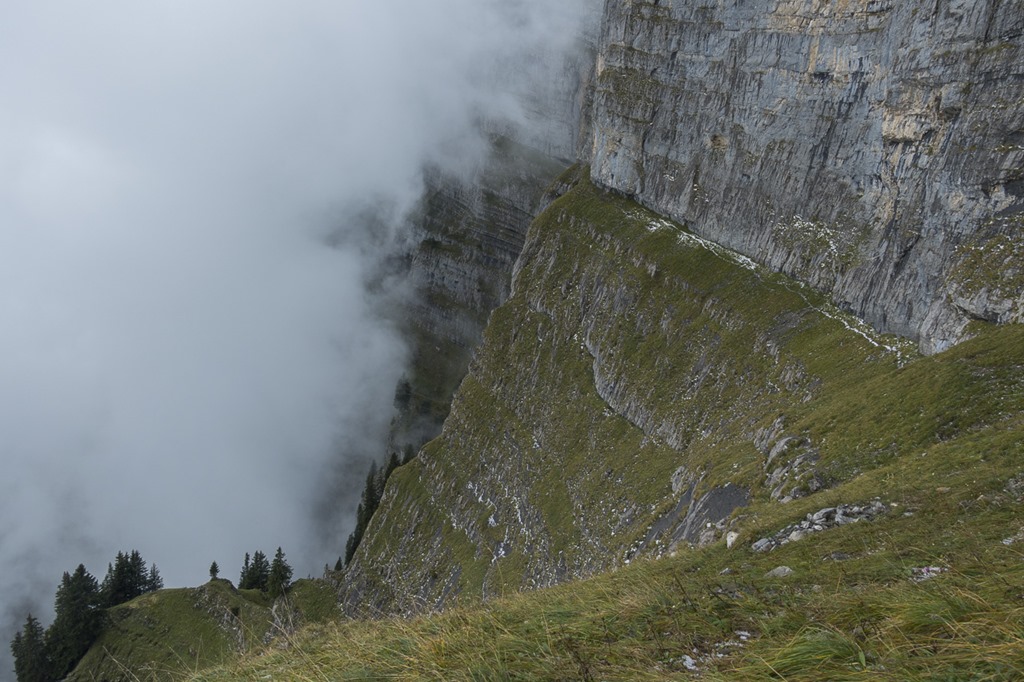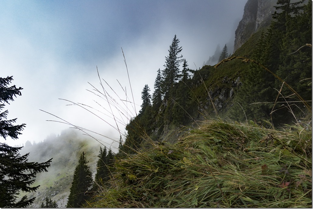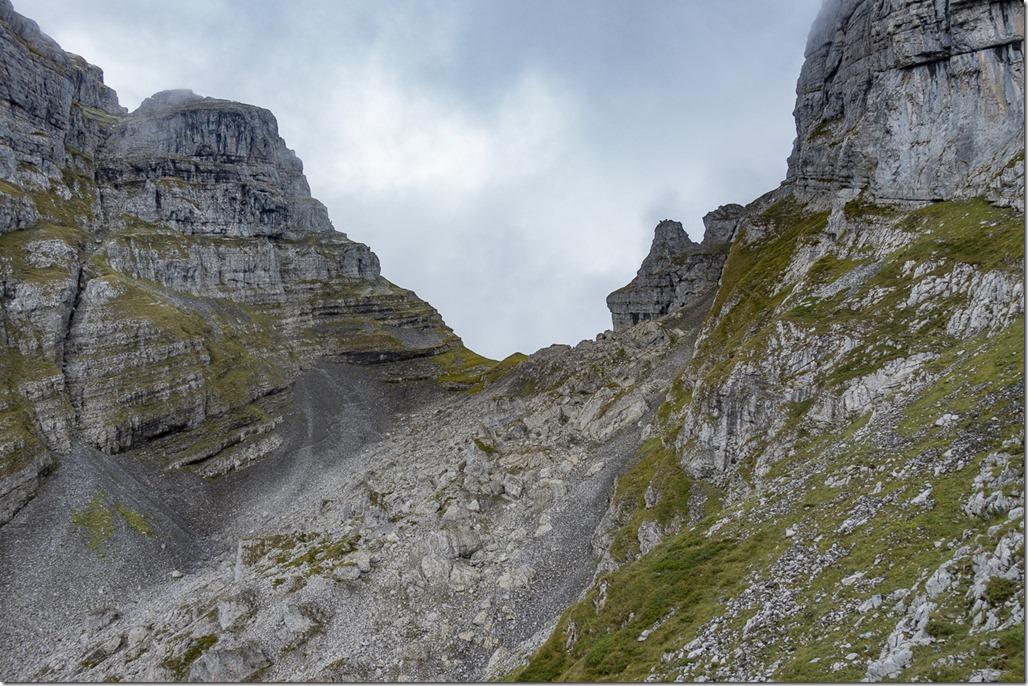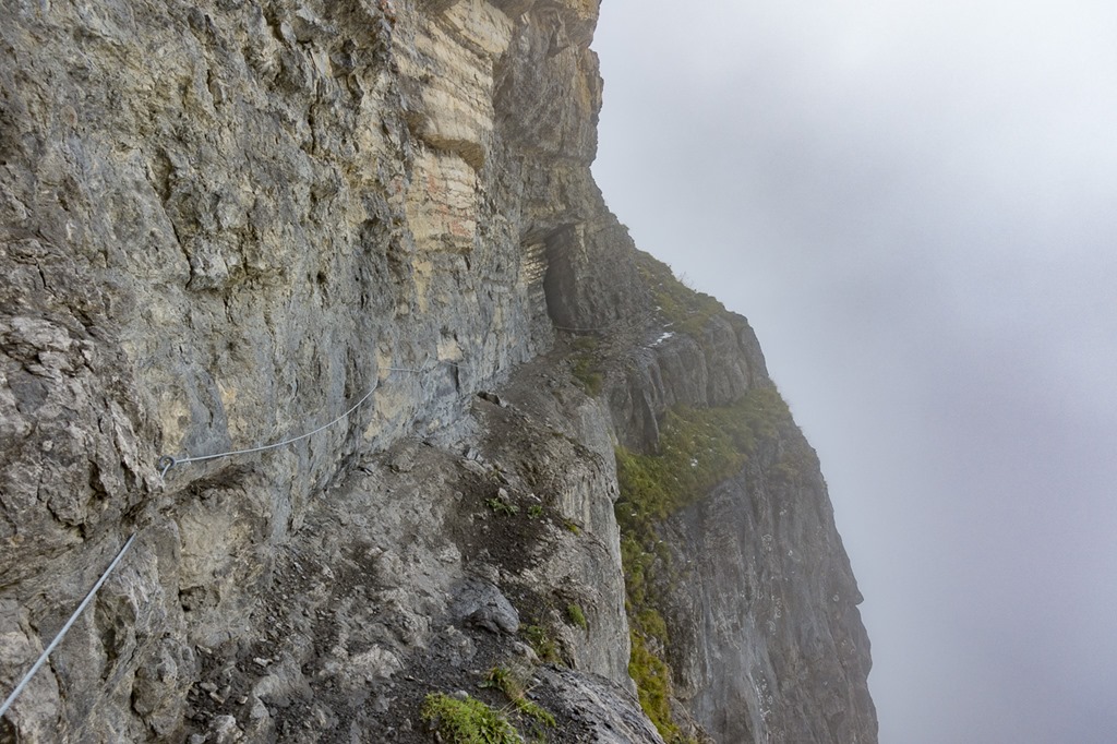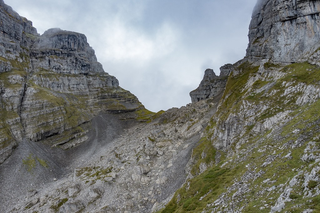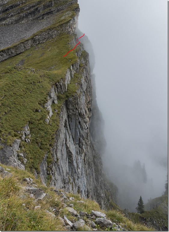 My plan was to take a long loop around Zuestoll mountain in order to reach the entry point for the Schnürliweg. I know there is a straight path to that point on the front of Zuestoll but it requires some abseiling. Nevertheless when I was on the the Palis Nideri which is the name for the passage between Zuestoll and Brisi I wanted to check out the path for a couple of meters. To my surprise a couple was coming from the other side. I was starting to chat with them. They were trying to do the trail from this side but had to return as the grass was wet and slippery. I later checked the entry point for the other side. Looks rather doable with the proper gear –> new project for next year Winking smile