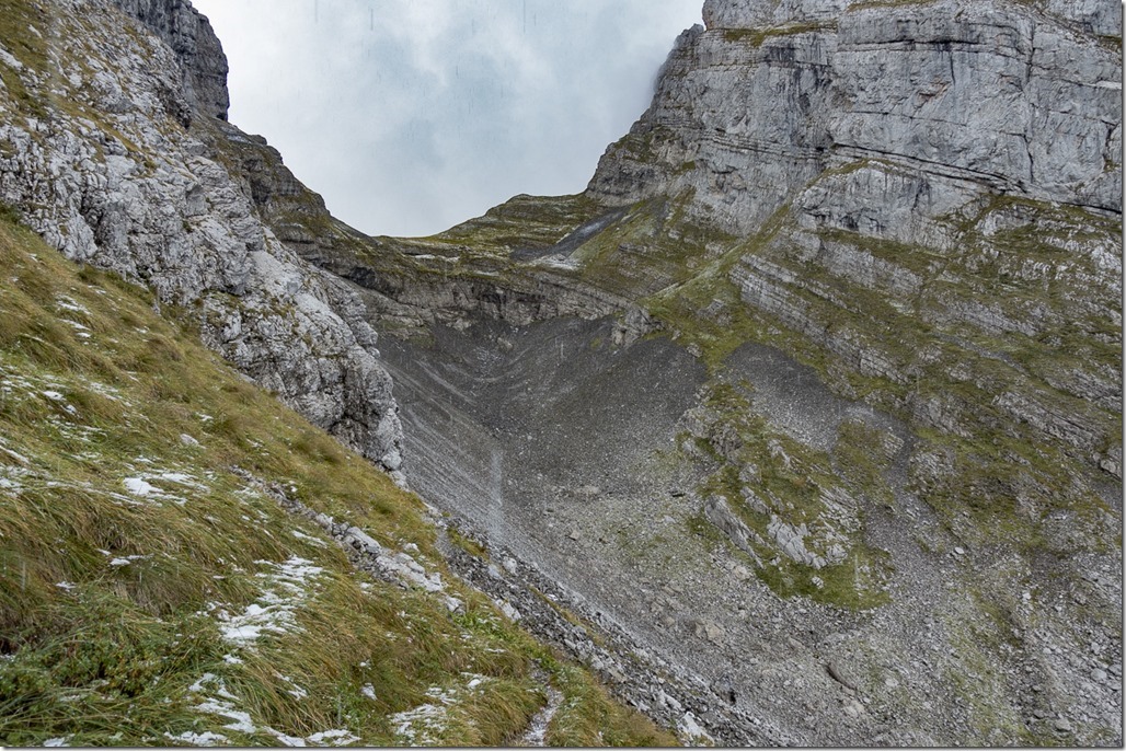 Now it started to snow, actually not snow but graupel. View back to the Palis Nideri pass.