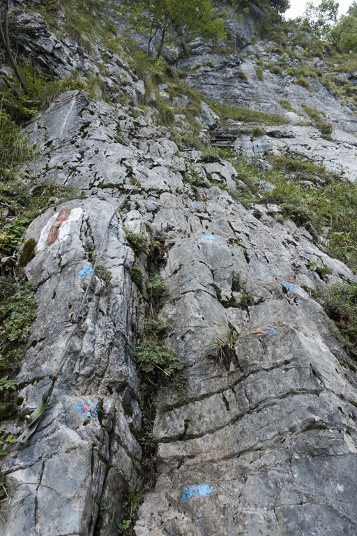 The first part of the hike was on an official blue-white-blue marked hiking trail to Alp Tschingla. Due the fact that the hiking trail was obviously also frequently used by cows and it had rained quite a bit during the last days it was rather difficult to get over it without making the shoes muddy. Luckily cows don’t seem to know how to used fixed ropes. So after the first section of ropes the trail was in a much better shape. The trail up to Alp Tschingla is frequently used, so the trail is well established and there are even some fixed ropes or other help in certain places. Somebody was even painting blue dots on the rock were you should put your feet. Later on the way down I met a father with his 3 kids. They also had their dog with them. He told me that the dog knows how to get up. There was only one place were he had to help the dog.