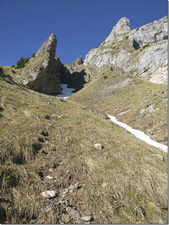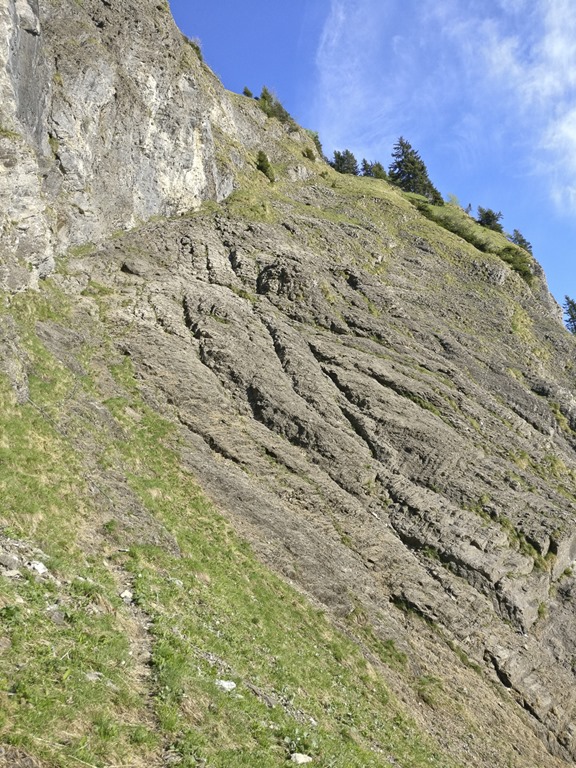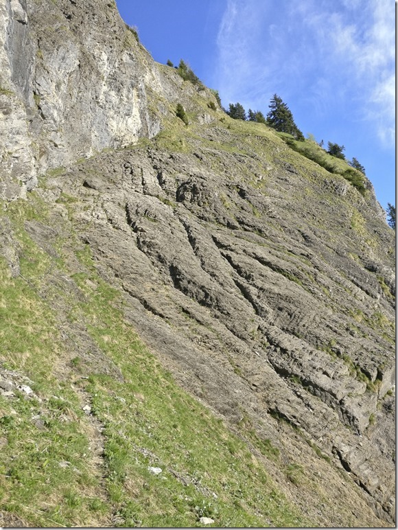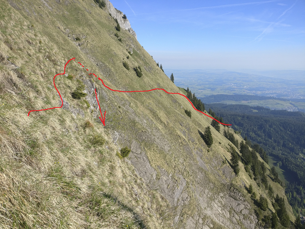 Je weiter ich kam, desto steiler wurde die Wiese. Sporadische blaue Markierungen belegten, dass ich immer noch auf dem richtigen Weg war. Etwa 100 Meter vor der Ende der Traverse, gab es plötzlich ein Abzweigung, der eine Weg ging steil nach oben, während der andere Weg weiter traversierte. Ich hatte von dieser Verzweigung gelesen. Der Weg nach oben war eine Umgehung der letzten sehr ausgesetzten Meter der Traverse. Der Weiterweg schien aber durchaus machbar zu sein und so verzichtete ich auf die Umgehung. Nach der nächsten Kurve sah es dann aber deutlich anders aus… Man stelle sich einen kaum ausgetretenen Pfad in einer sehr steilen Wiese vor und kombiniere das mit einer Felswand, die etwa 150 Meter nach unten geht. Die 150 Meter spielen bei dieser Überlegung eigentlich keine grosse Rolle. Viel entscheidender ist, dass sich der Weg und die Felswand bis auf rund 1 Meter annähern, was die Konzentration und den Pulsschlag des Wanderers doch deutlich beeinflussten. Da kann ich nur wiederholen, was andere vor mir auch schon erwähnt haben: “Bei Nässe ist von dieser Tour dringend abzuraten”