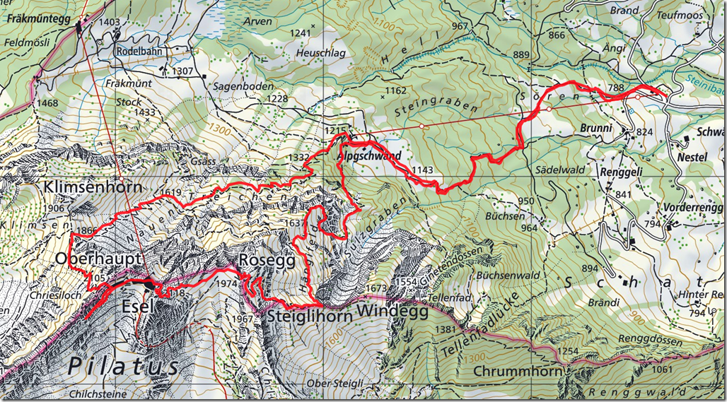 Los ging es um 06:00. Vor mir lag die Rosegg, ein Vorgipfel des Pilatus. Auf dem folgenden Bild sieht man den Verlauf der Tour übers Ängifeld.