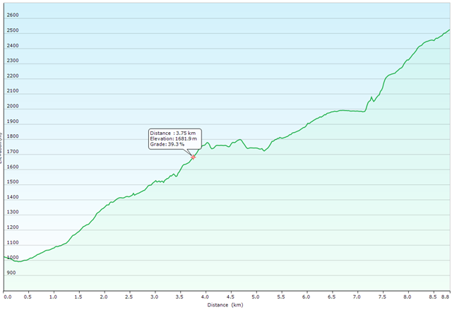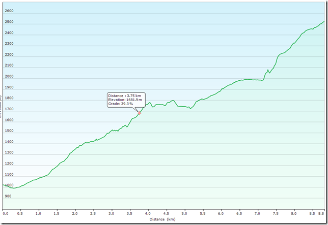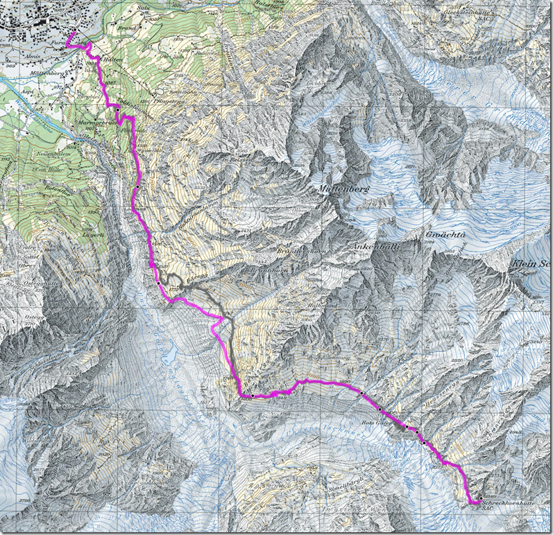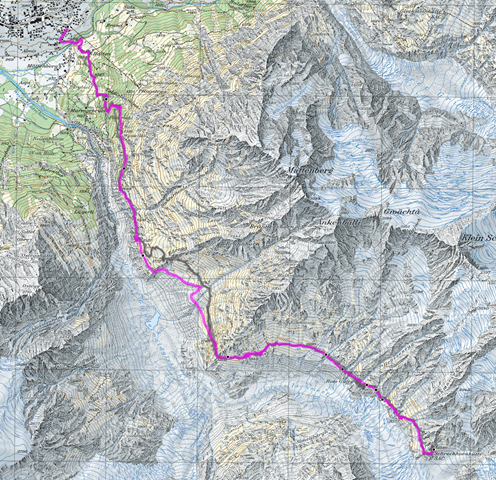 Vom Höhenprofil her nichts aussergewöhnliches, wenn man das rauf und runter unterwegs dazu zählt waren es schlussendlich 2200m. Der Weg ist ab Bäregg ein alpiner Wanderweg (blau-weiss-blau), wobei eigentlich nur der letzte Teil diese Prädikat verdient. Auf obiger Karte sieht man gut, wie der geplante (lila) vom mit dem GPS aufgezeichneten Weg (scharz) bei Bäregg abweicht. Das liegt daran, dass an dieser Stelle der Weg nach 2005 wegen eines Hangrutsches verschoben werden musste. Mein (Digitale)Karte ist offensichtlich noch nicht auf dem neusten Stand.