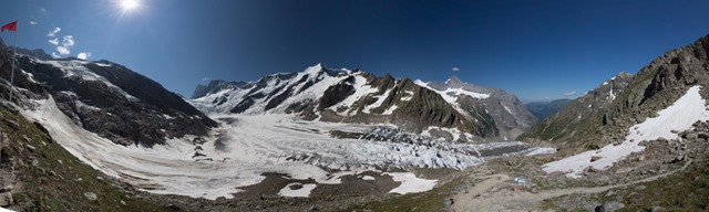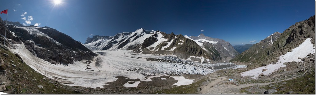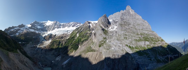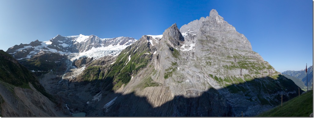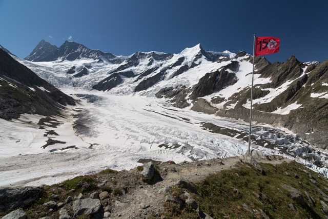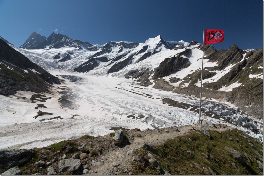 Auf der rechten Seite mit einer kleiner Wolke ist der Eiger, links davon, schneebedeckt, ist der Mönch. Die Bergnamen in der Mitte habe ich noch nie gehört, deshalb lassen wir die einfach aus. Der letzte Berg bevor es links wieder “bergauf” geht ist das Finsteraarhorn. Und dann rechts von der Fahne ist nochmals das Lauteraarhorn. Wen’s noch nicht klar ist, hier ist der Link dazu.