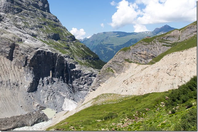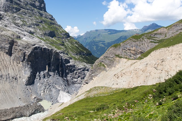 Schon wieder fast zurück auf der Bäregg, gut zu sehen der Felsabbruch von 2006 auf der linken Talseite.