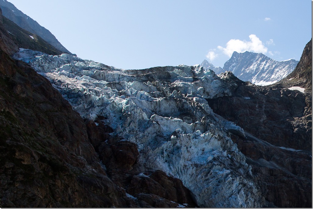 Eben ist die Sonne über den Berggipfeln hervorgekommen und scheint nun schräg in den Gletscher, der ganz blau schimmert.