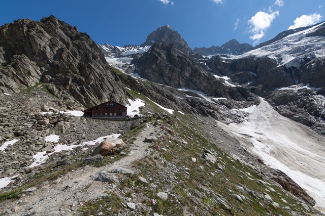 Angekommen! Die Schreckhornhütte, der Gipfel in der Mitte ist logischerweise das Schreckhorn und rechts davon das Lauteraarhorn.