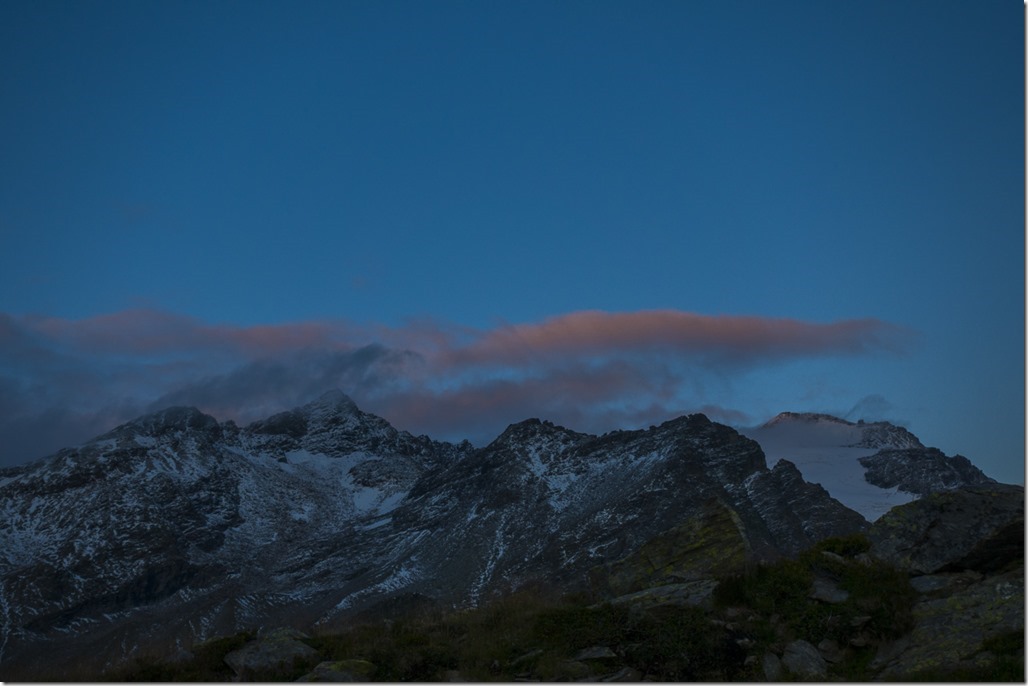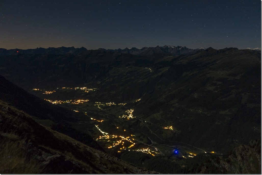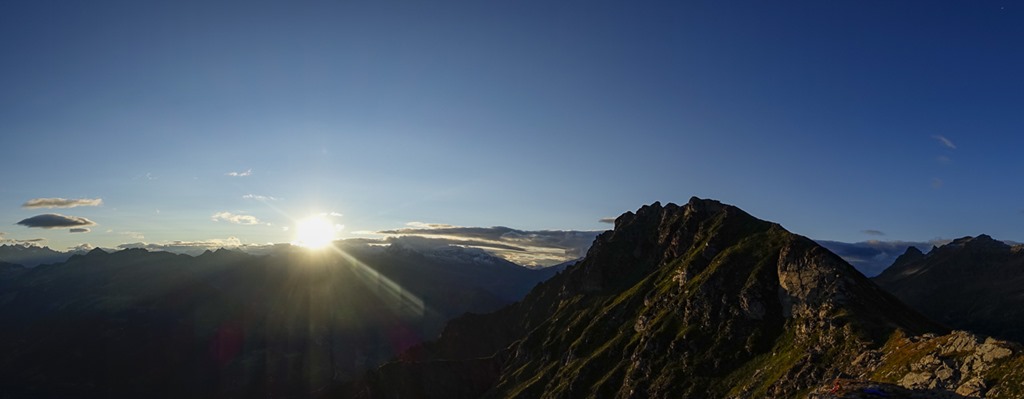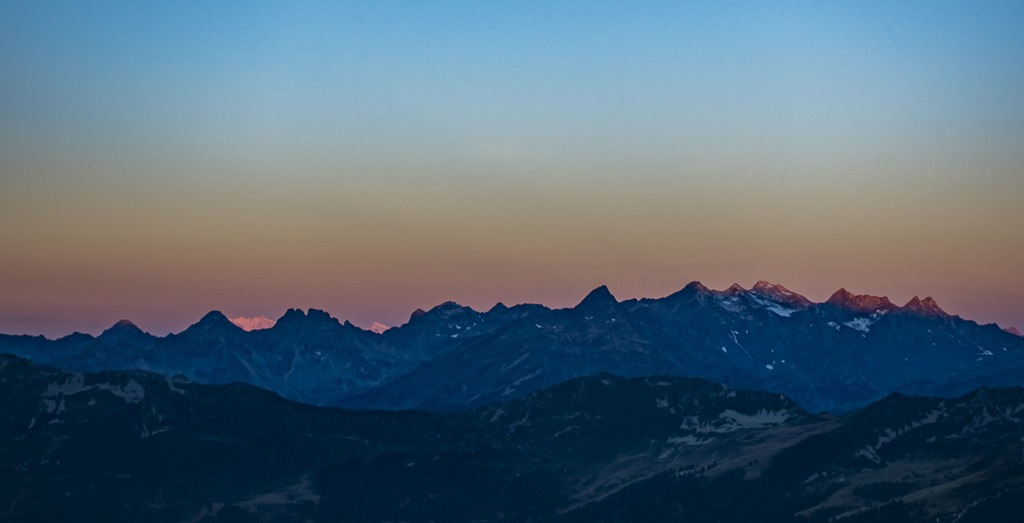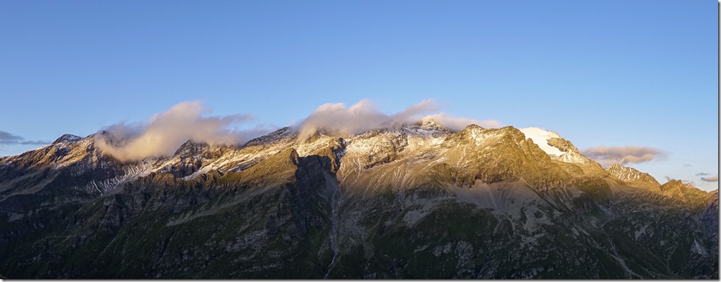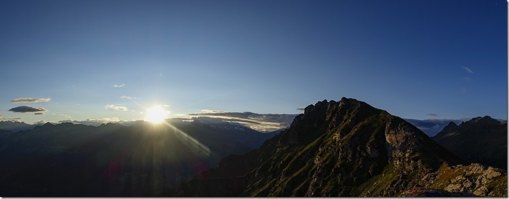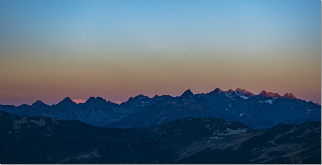Some of the mountains are already in the sun. The white one on the left side of the picture is actually the highest one in Switzerland “Dufourspitze” at 4634m. I checked on the map: It is 110km away from us.