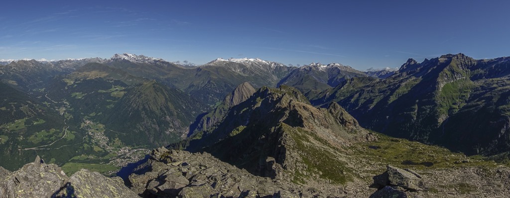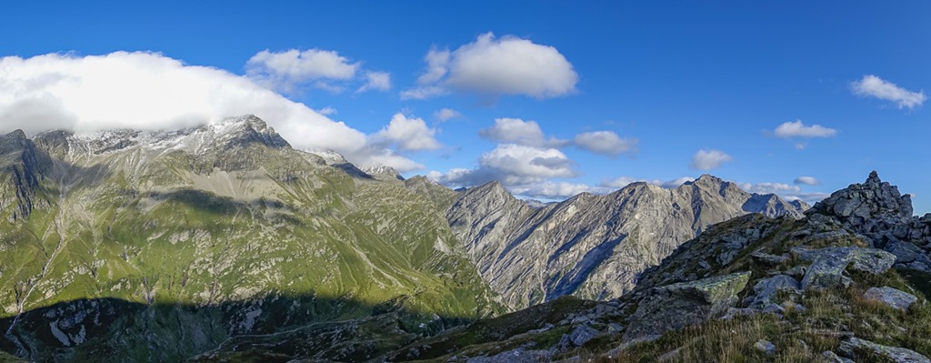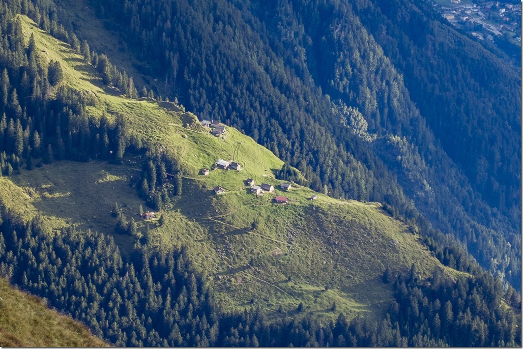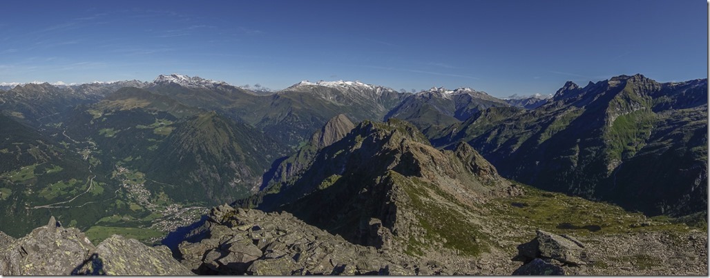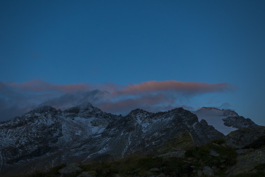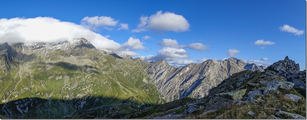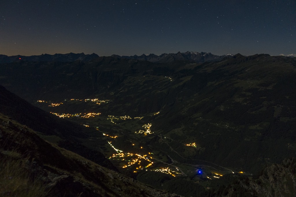 Some of the mountains are already in the sun. The white one on the left side of the picture is actually the highest one in Switzerland “Dufourspitze” at 4634m. I checked on the map: It is 110km away from us.